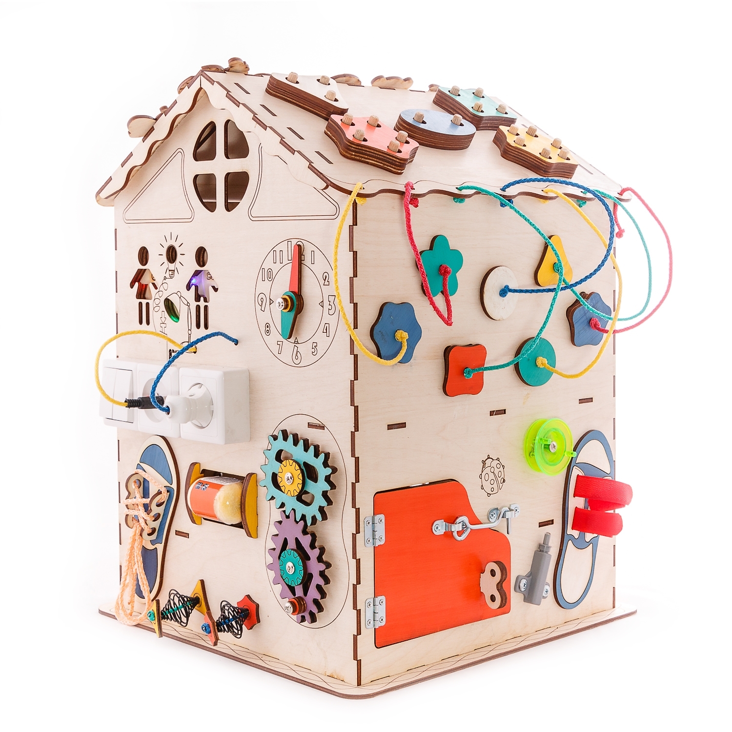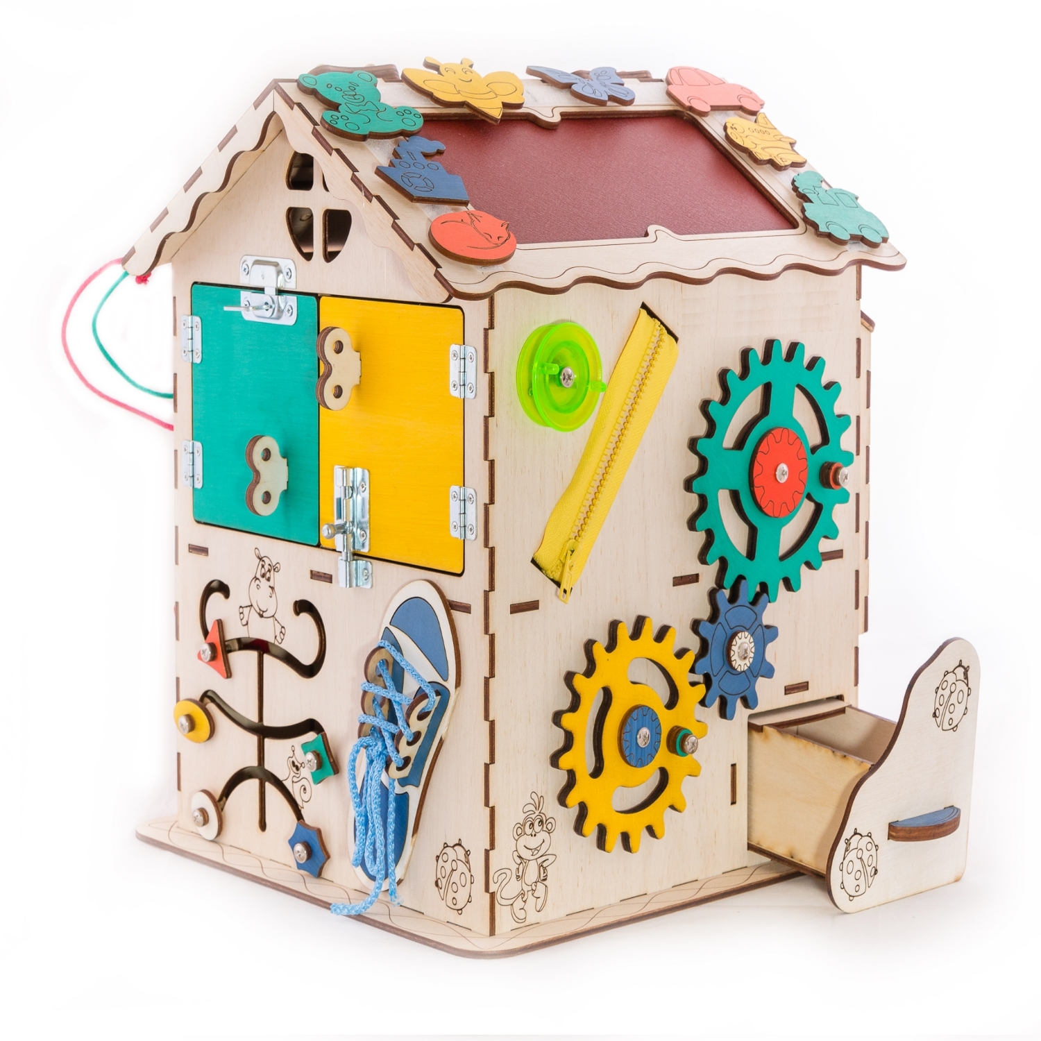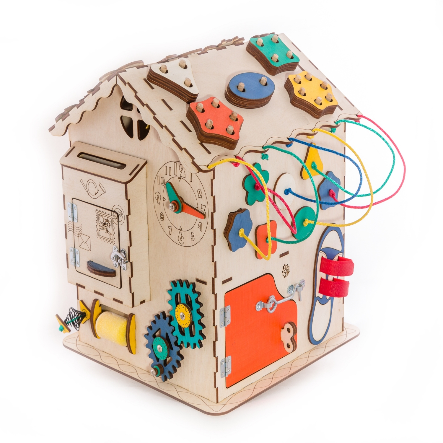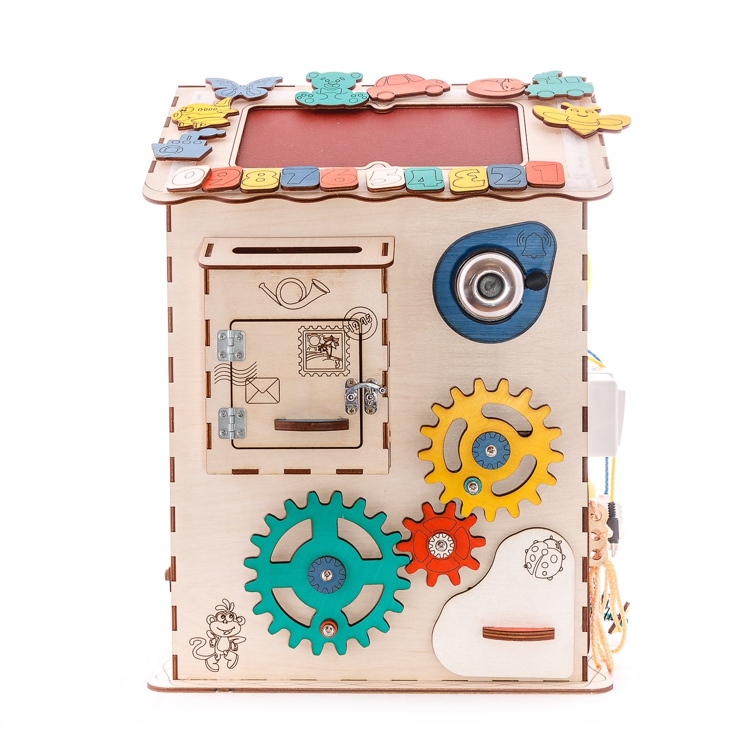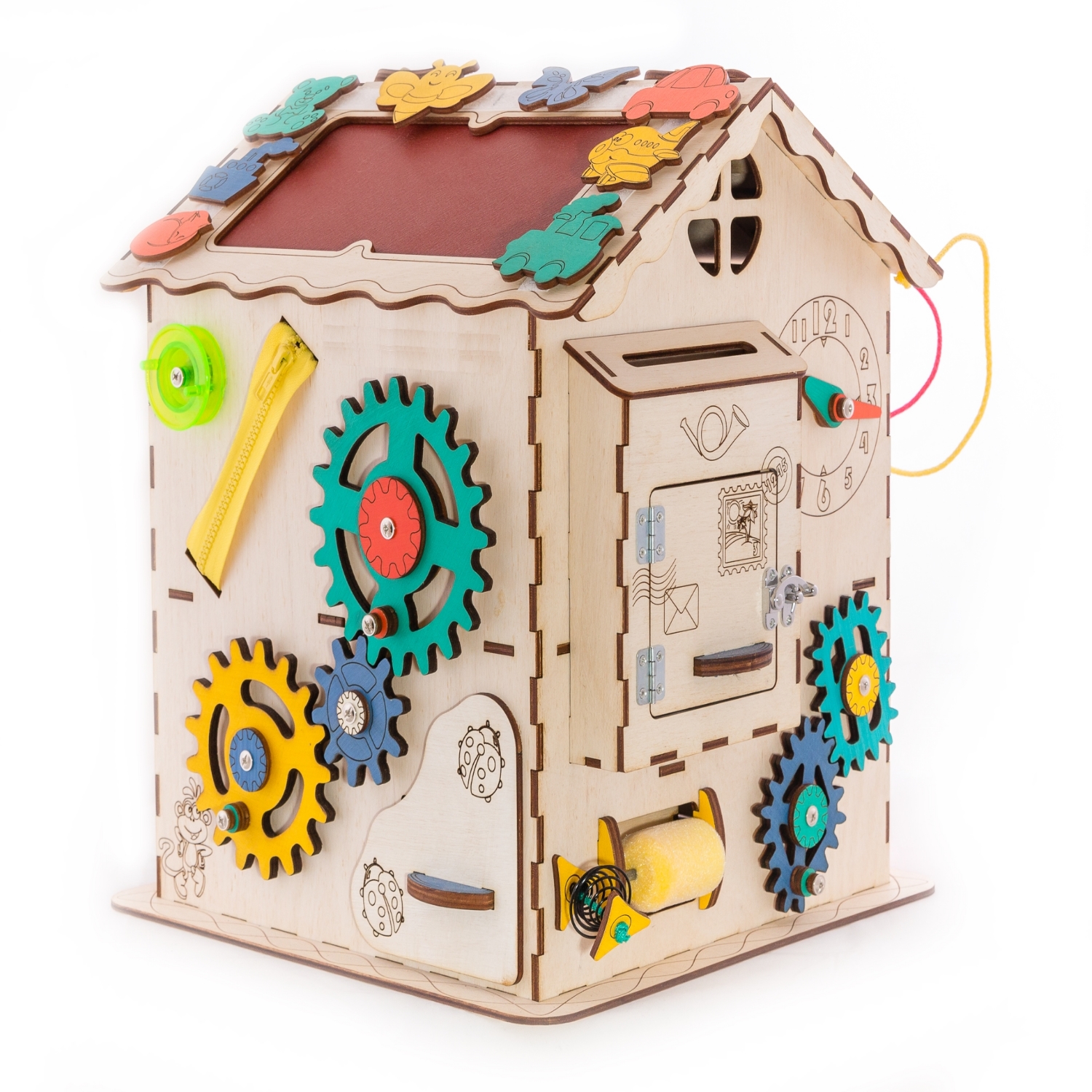 1. Набор дверей с замочками (3 шт) 2. Почтовый ящик 3. Катушка для лески с трещоткой 4. Набор шестерен круглых 5. Набор шестерен квадратных 6. Кроссовки со шнуровкой и липучкой 7. Зиппер 8. Фигурки на пружинке 9. Часы 10. Лабиринт из 5 фигур 11. Вращающийся валик 12. Шкантовый сортер (на крыше) 13. Магнитное поле, на котором можно писать мелом 14. Ящичек - тайничок 15. Цифры на липучке 16. Фигурки на липучке 17. 2 зоны для хранения других игрушек