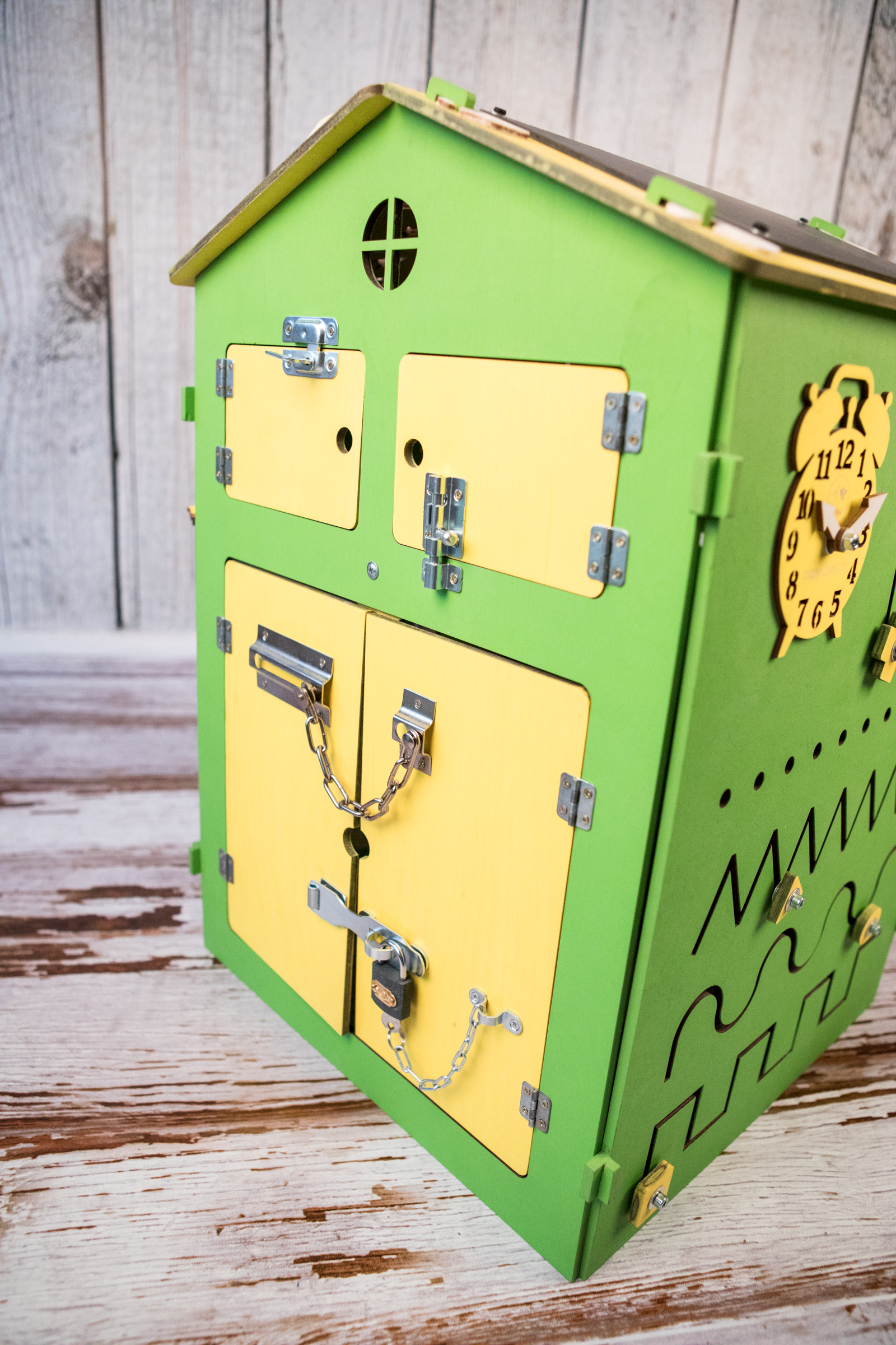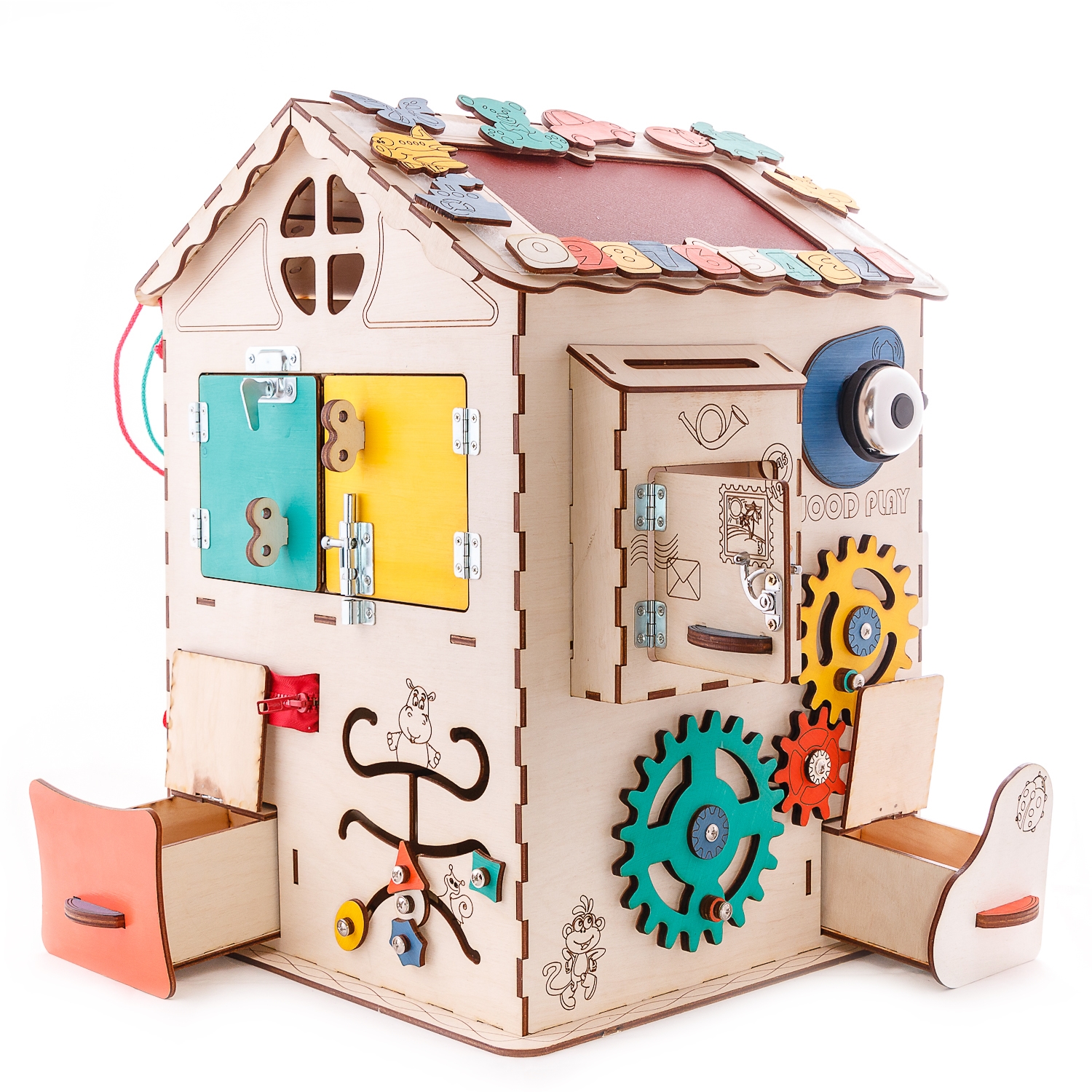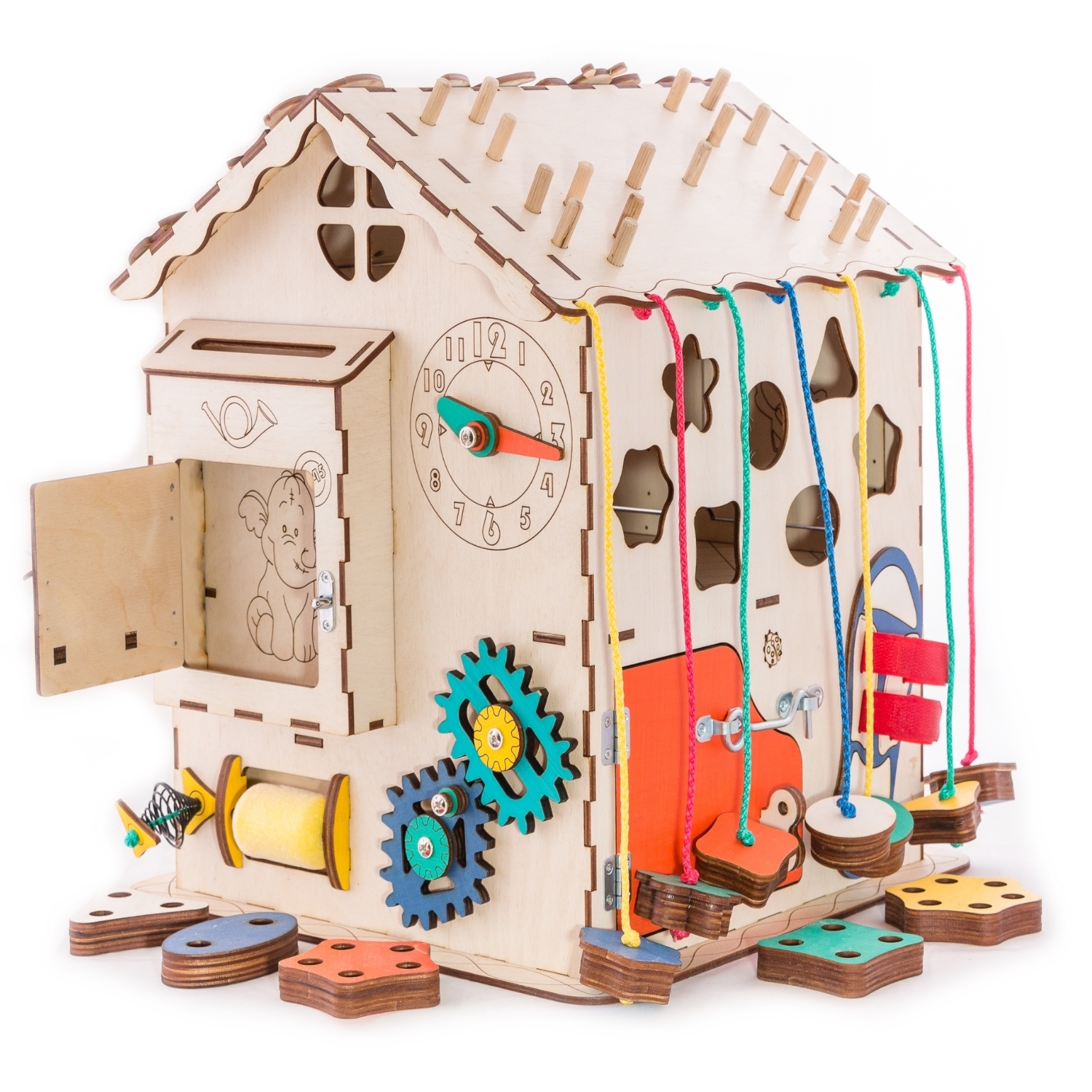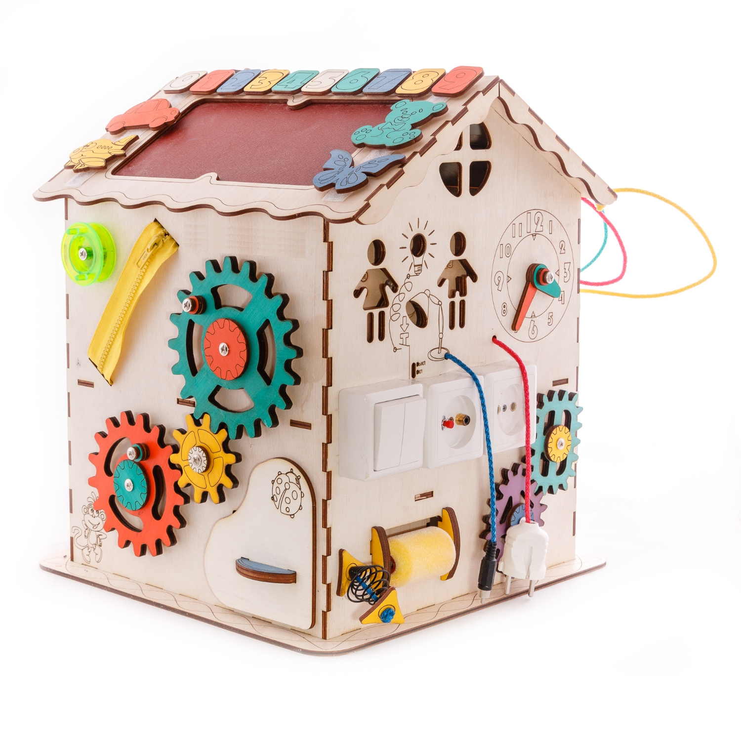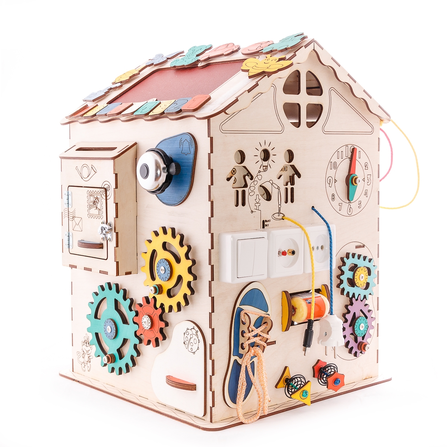 1. Набор дверей с замочками (3 шт) 2. Почтовый ящик 3. Катушка для лески с трещоткой 4. Набор шестерен круглых 5. Набор шестерен квадратных 6. Кроссовки со шнуровкой и липучкой 7. Зиппер 8. Фигурки на пружинке 9. Часы 10. Лабиринт из 5 фигур 11. Вращающийся валик 12. Шкантовый сортер (на крыше) 13. Магнитное поле, на котором можно писать мелом 14. Ящичек - тайничок 15. Цифры на липучке 16. Фигурки на липучке 17. 2 зоны для хранения других игрушек