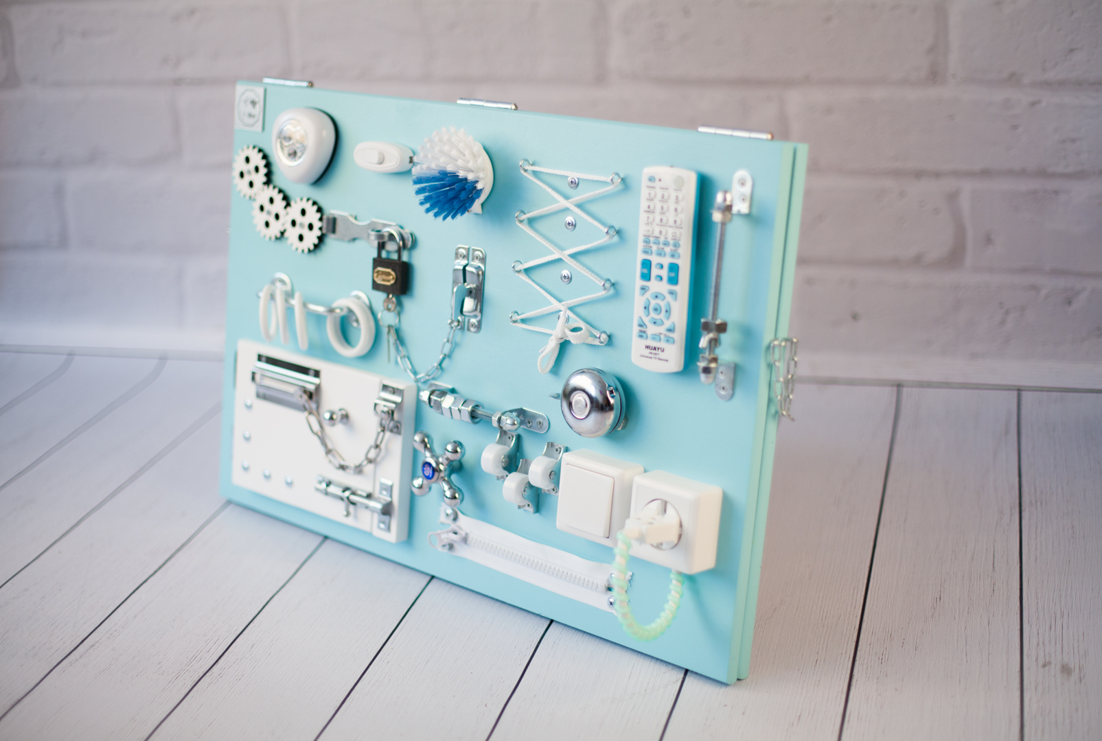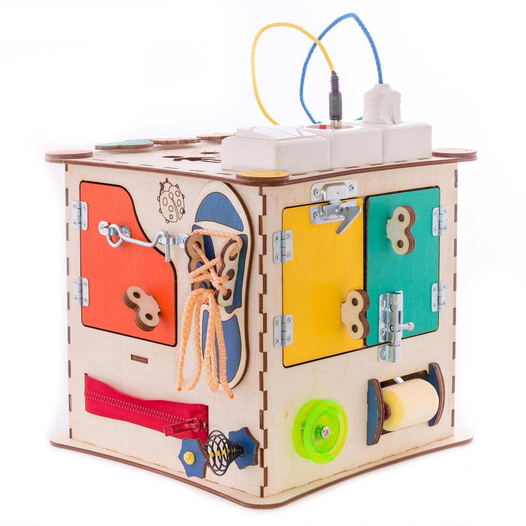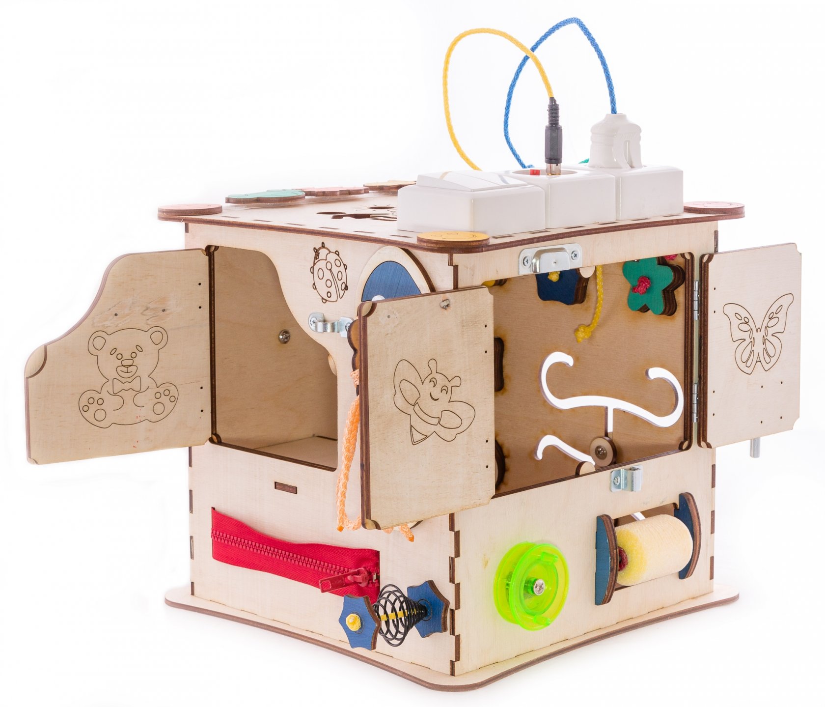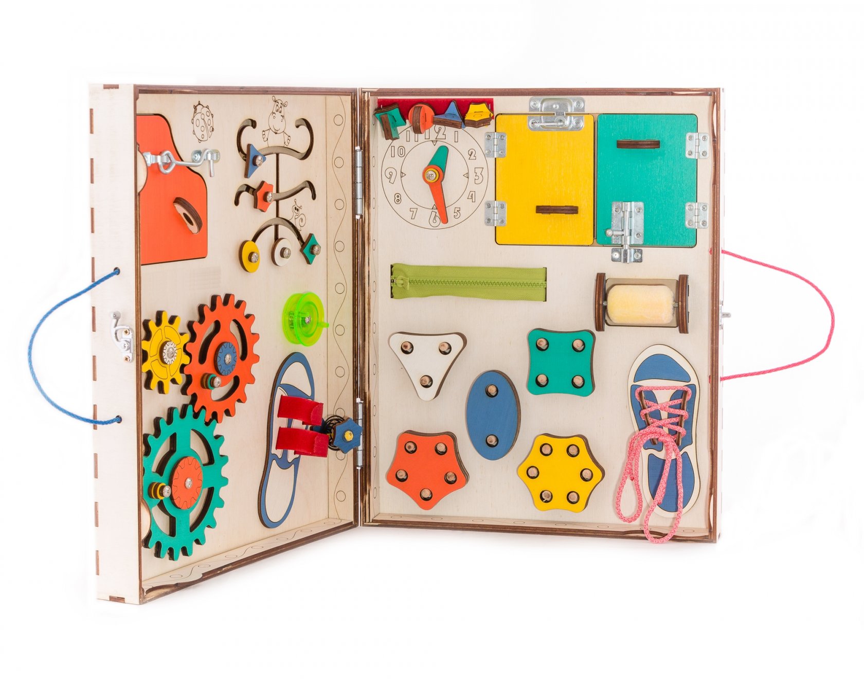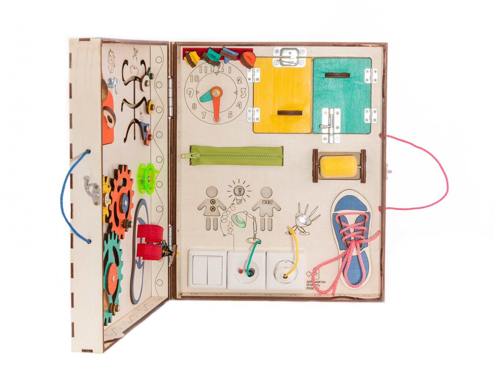 1. Набор дверей с замочками (3 шт) 2. Набор шестерен 3. Кроссовки со шнуровкой 4. Катушка для лески с трещоткой 5. Зиппер 6. Вращающийся валик 7. Лабиринт из 5 фигур 8. Сортер шкантовый из 5 фигур 9. Игрушки на липучке 10. Шкатулка – тайничок 11. Место для хранения других игрушек