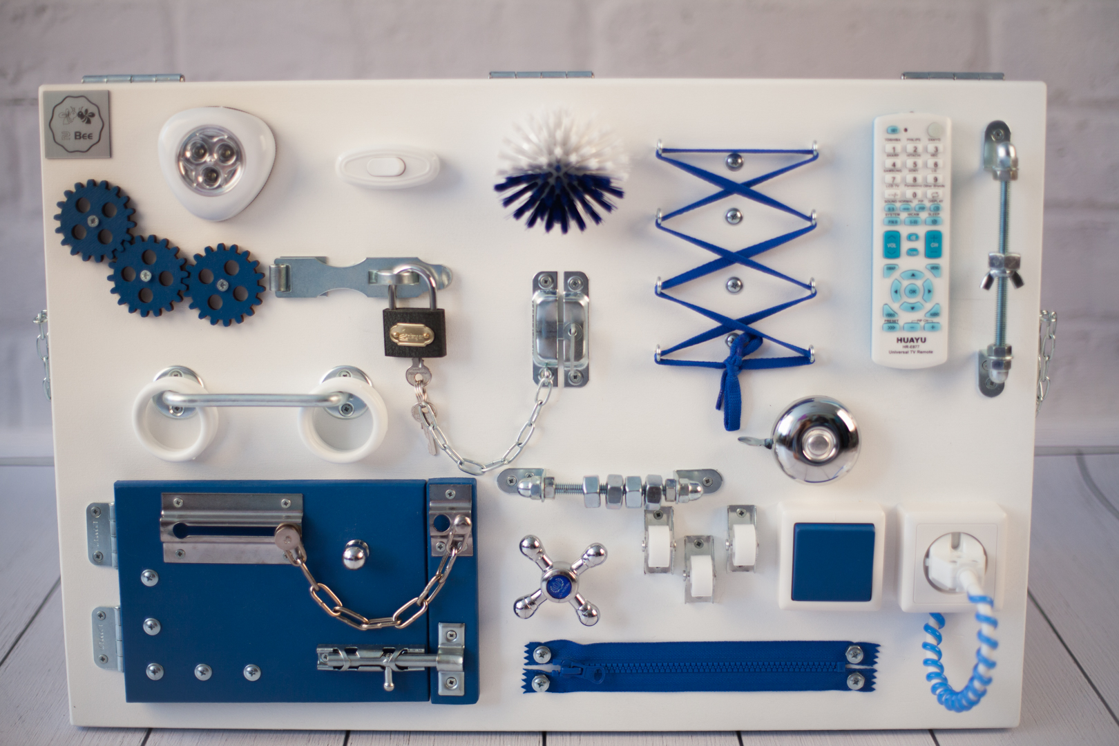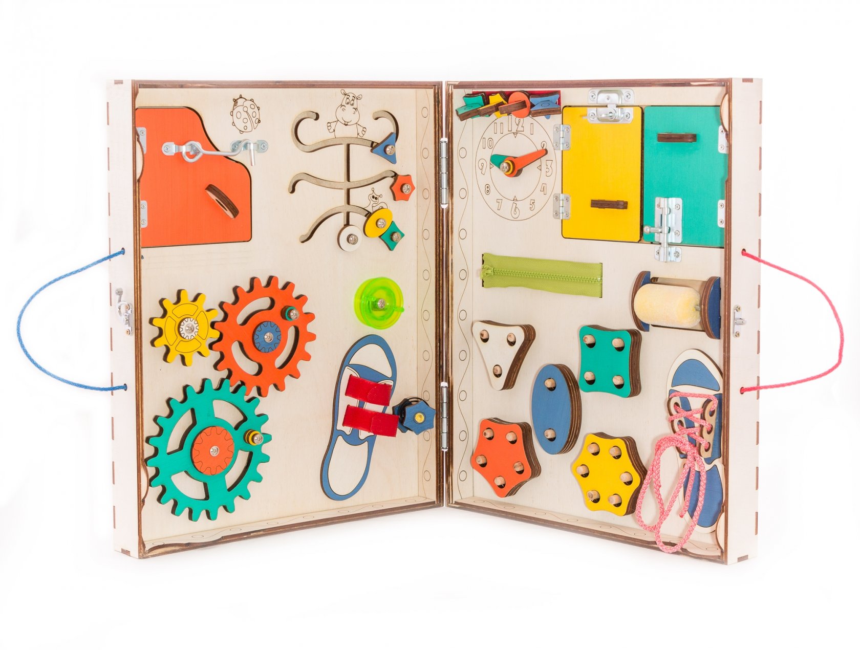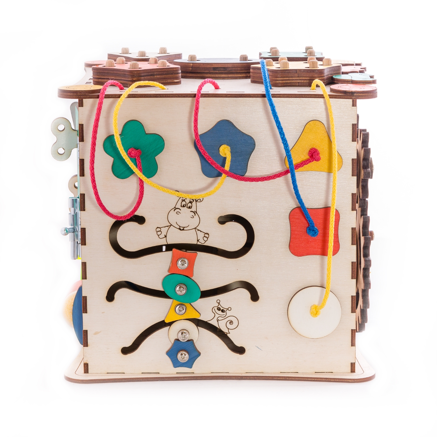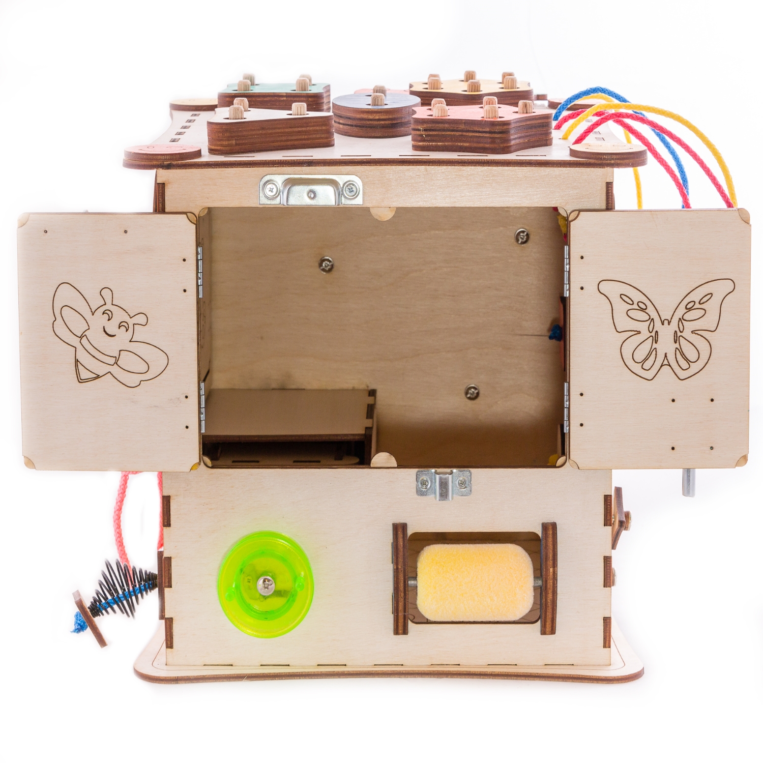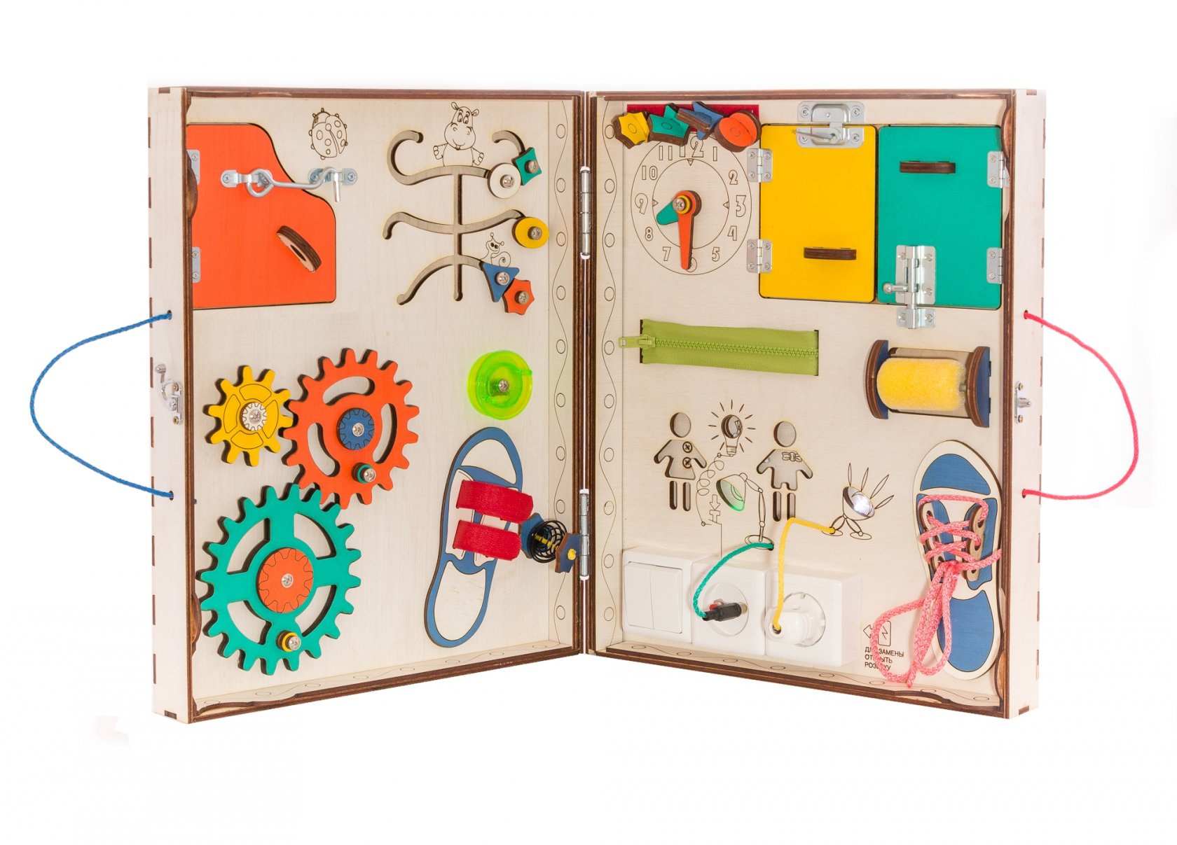 1. Набор дверей с замочками (3 шт) 2. Набор шестерен 3. Кроссовки со шнуровкой 4. Катушка для лески с трещоткой 5. Зиппер 6. Вращающийся валик 7. Лабиринт из 5 фигур 8. Сортер шкантовый из 5 фигур 9. Игрушки на липучке 10. Шкатулка – тайничок 11. Место для хранения других игрушек