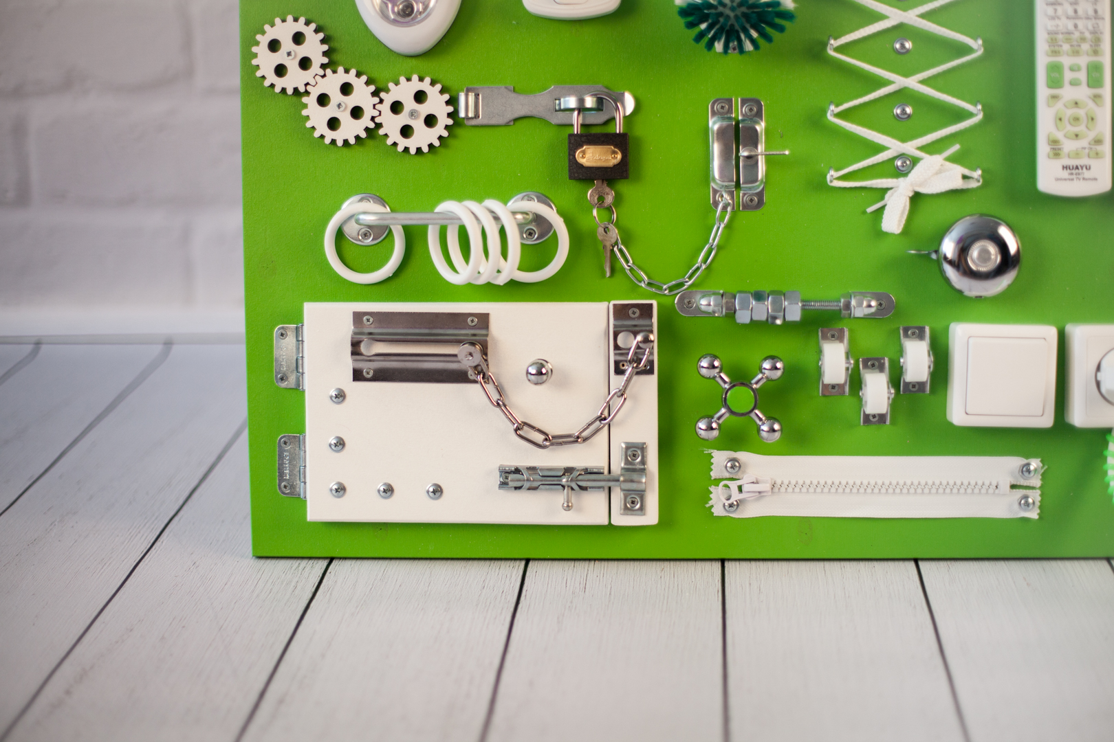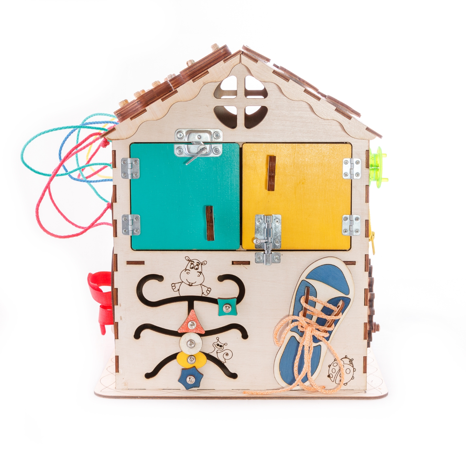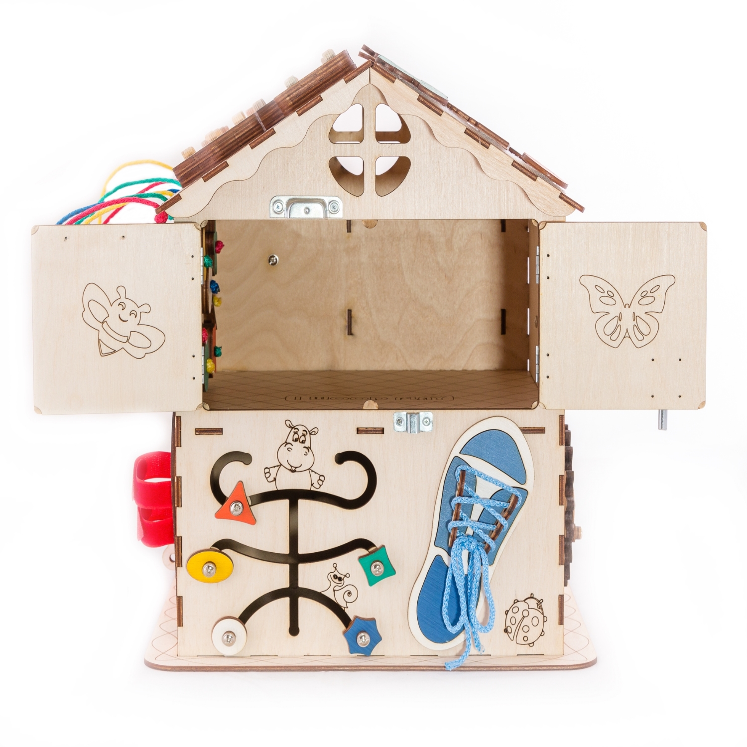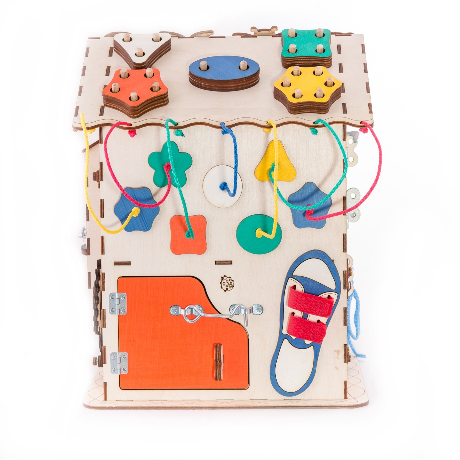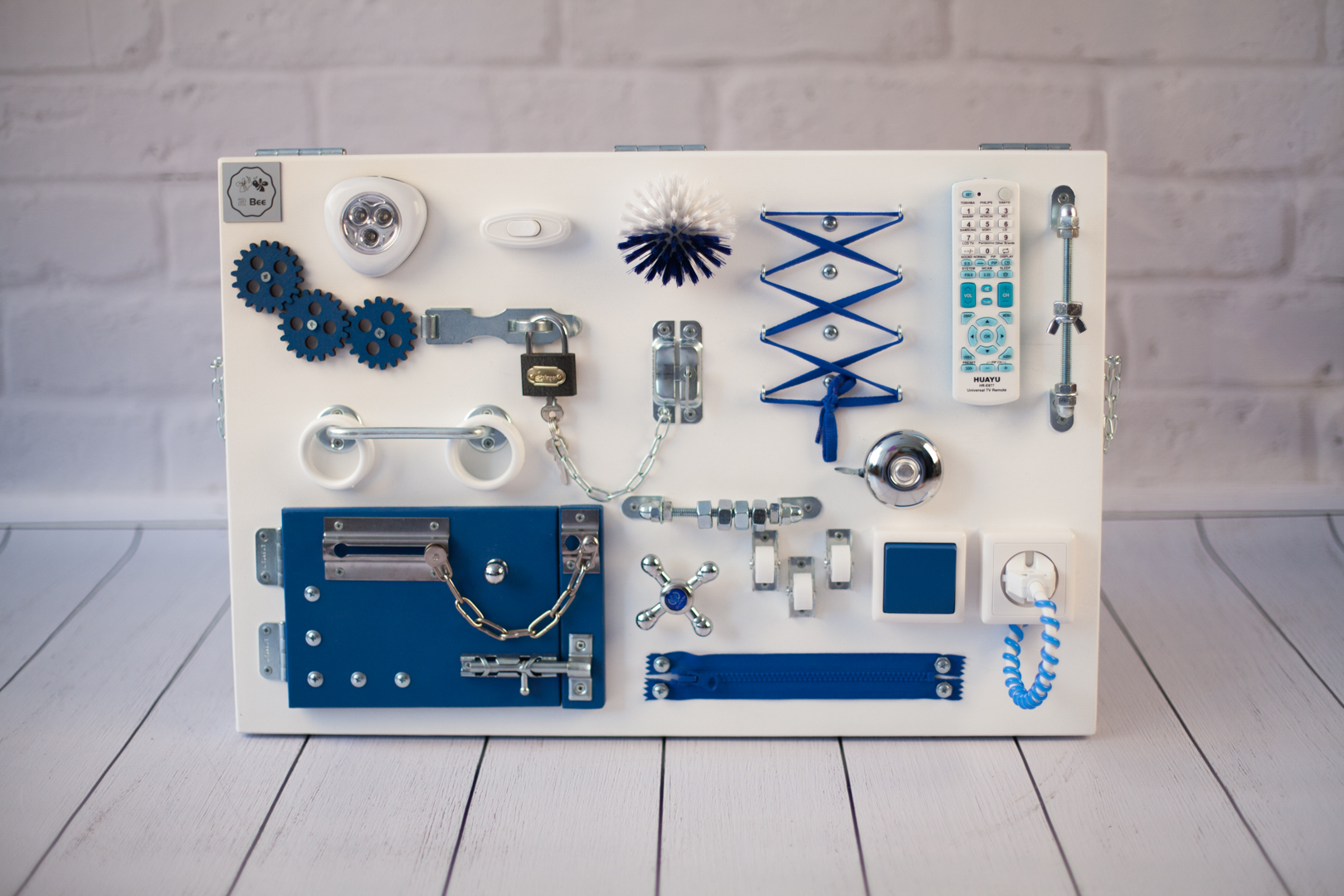 1. Набор дверей с замочками (3 шт) 2. Набор шестерен 3. Кроссовки со шнуровкой 4. Катушка для лески с трещоткой 5. Зиппер 6. Вращающийся валик 7. Лабиринт из 5 фигур 8. Сортер шкантовый из 5 фигур 9. Игрушки на липучке 10. Шкатулка – тайничок 11. Место для хранения других игрушек