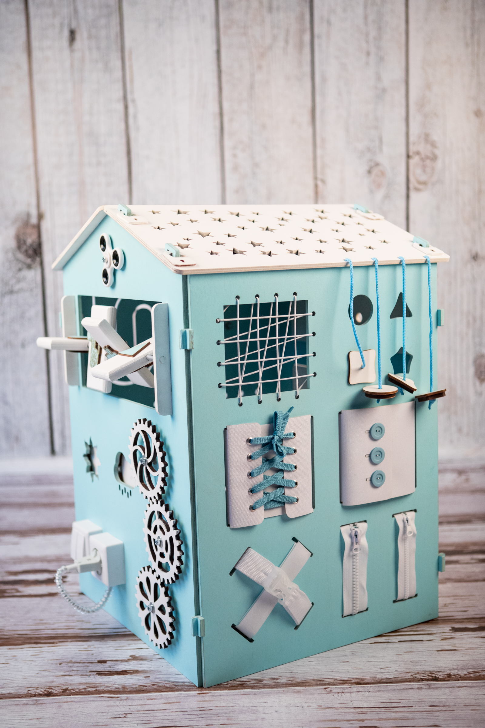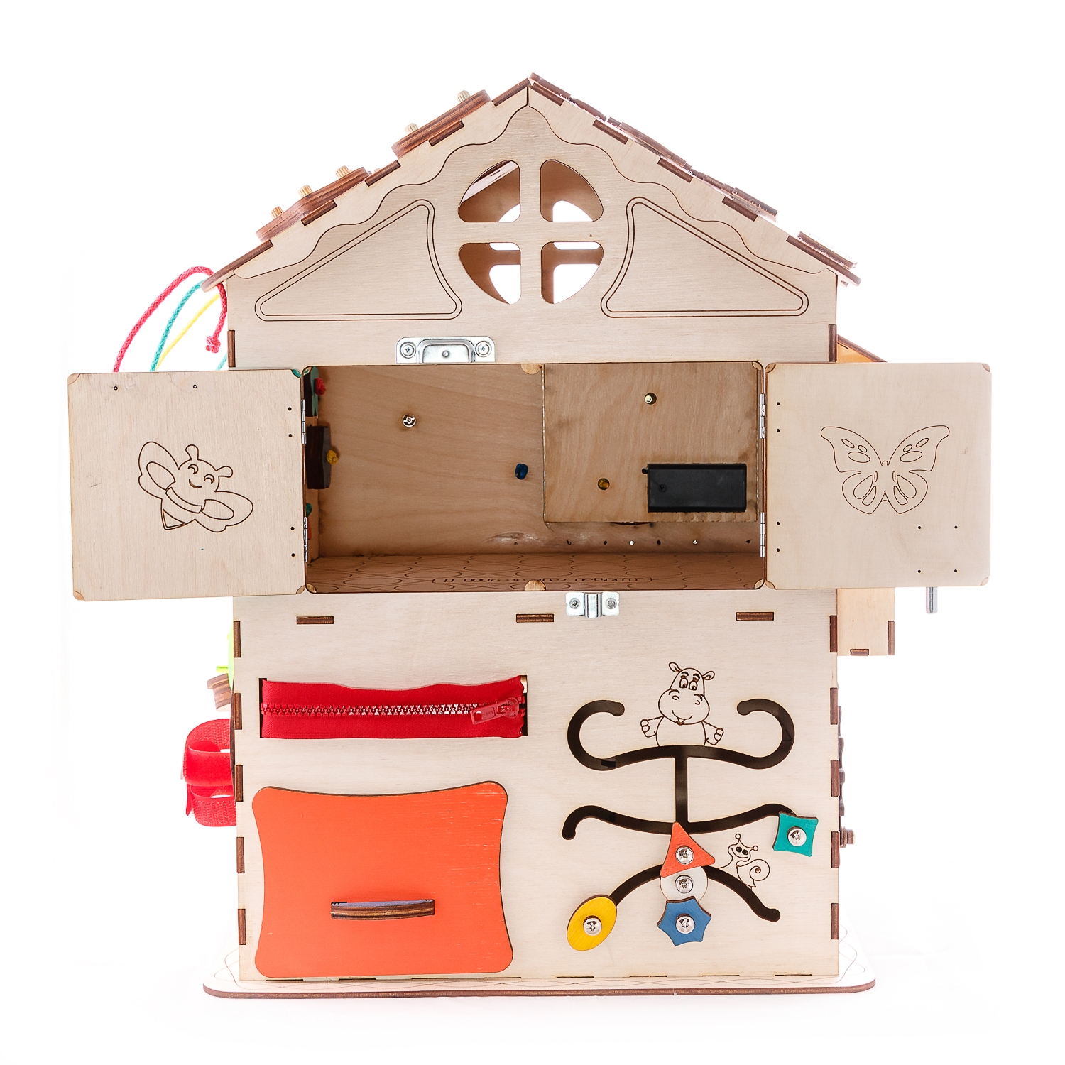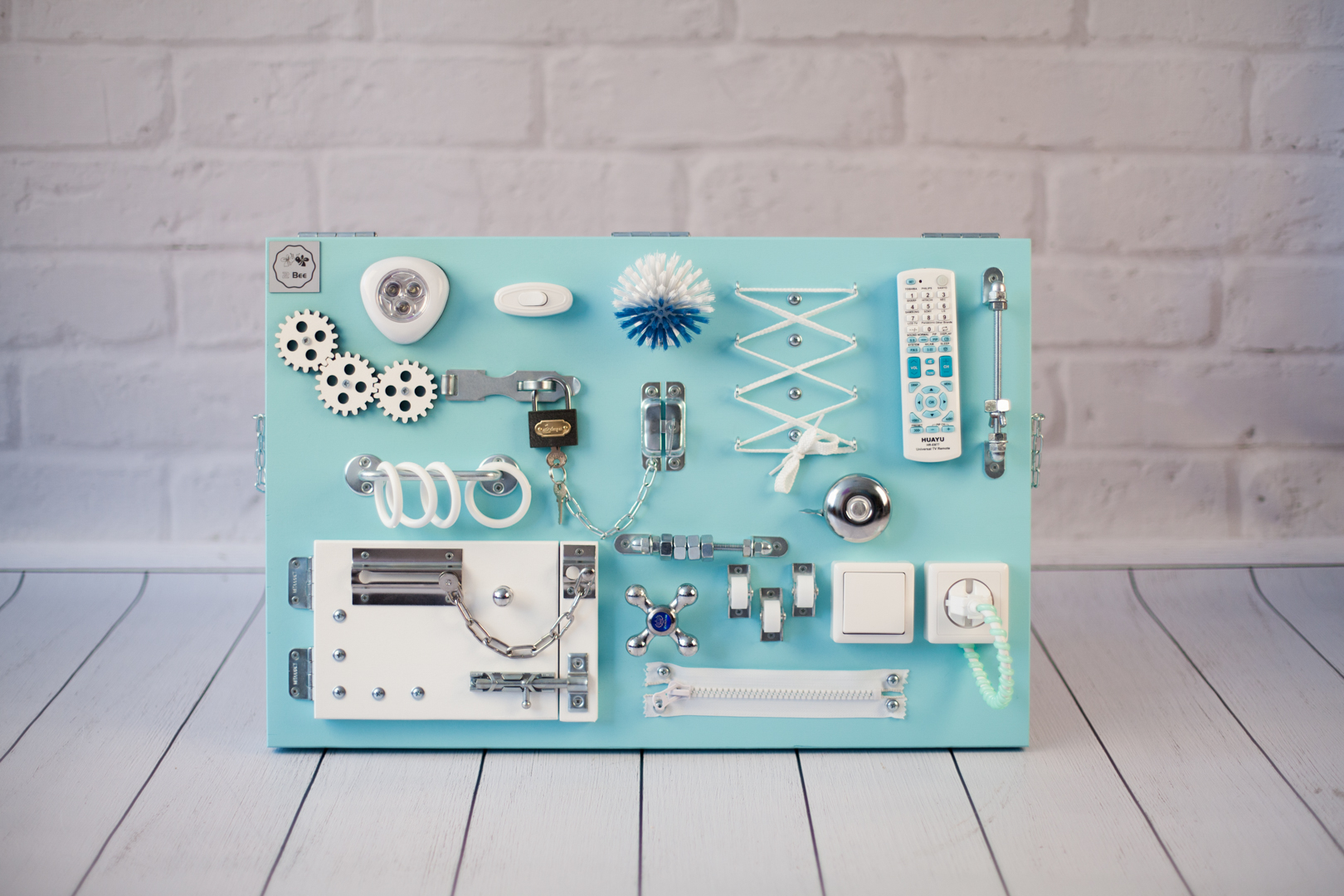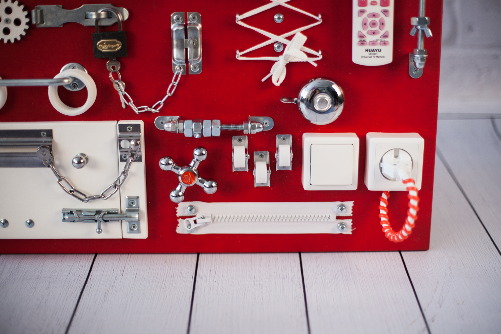 1. Набор дверей с замочками (3 шт) 2. Набор шестерен 3. Кроссовки со шнуровкой 4. Катушка для лески с трещоткой 5. Зиппер 6. Вращающийся валик 7. Лабиринт из 5 фигур 8. Сортер шкантовый из 5 фигур 9. Игрушки на липучке 10. Шкатулка – тайничок 11. Место для хранения других игрушек