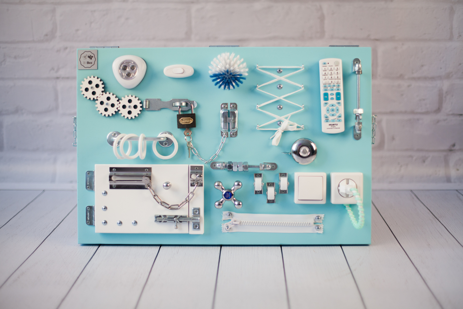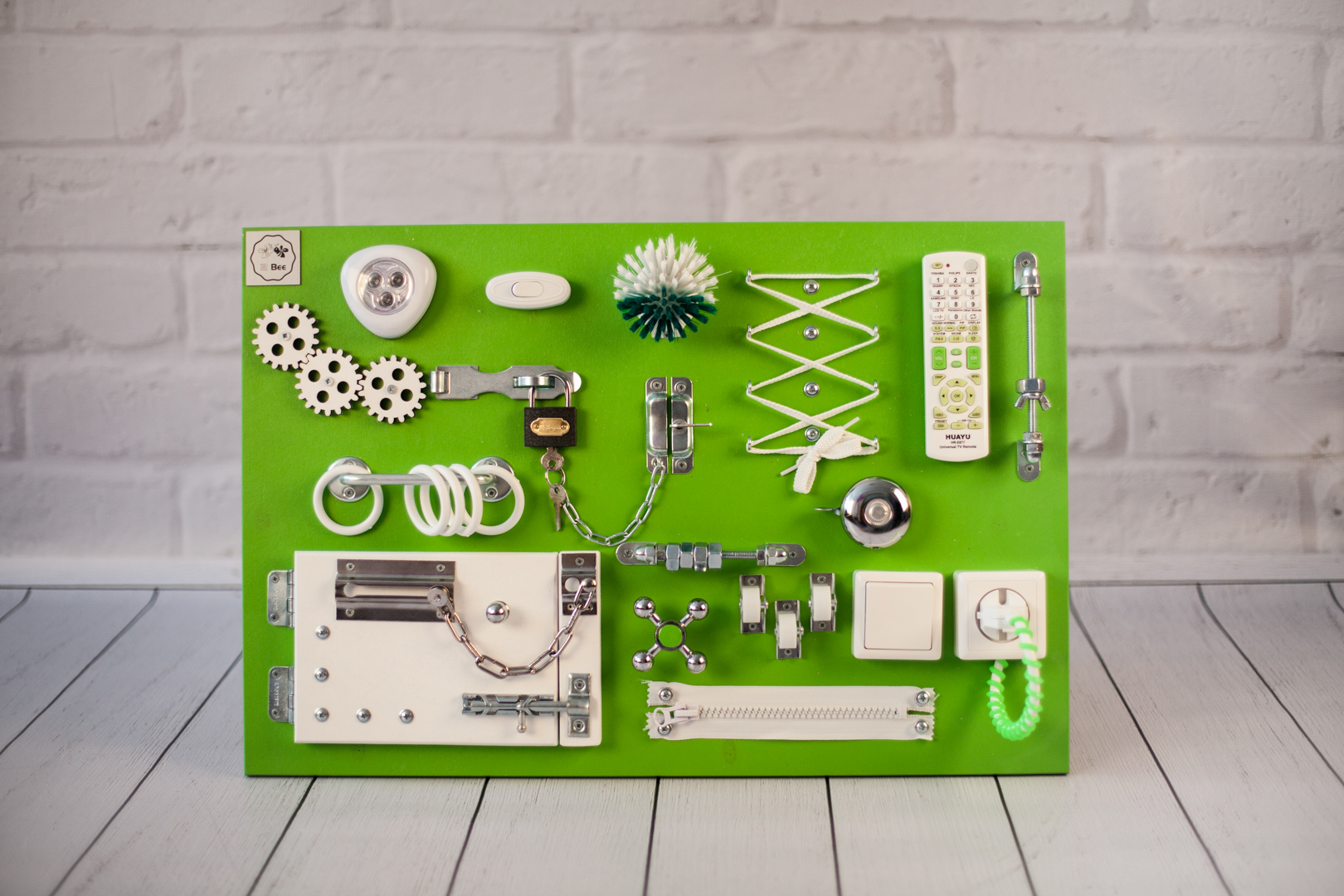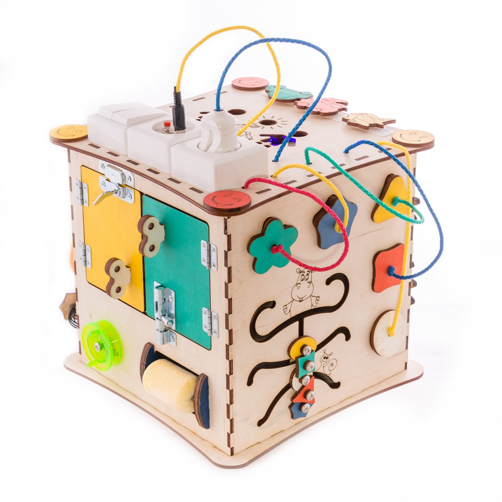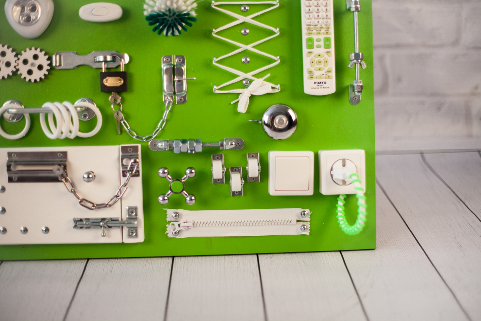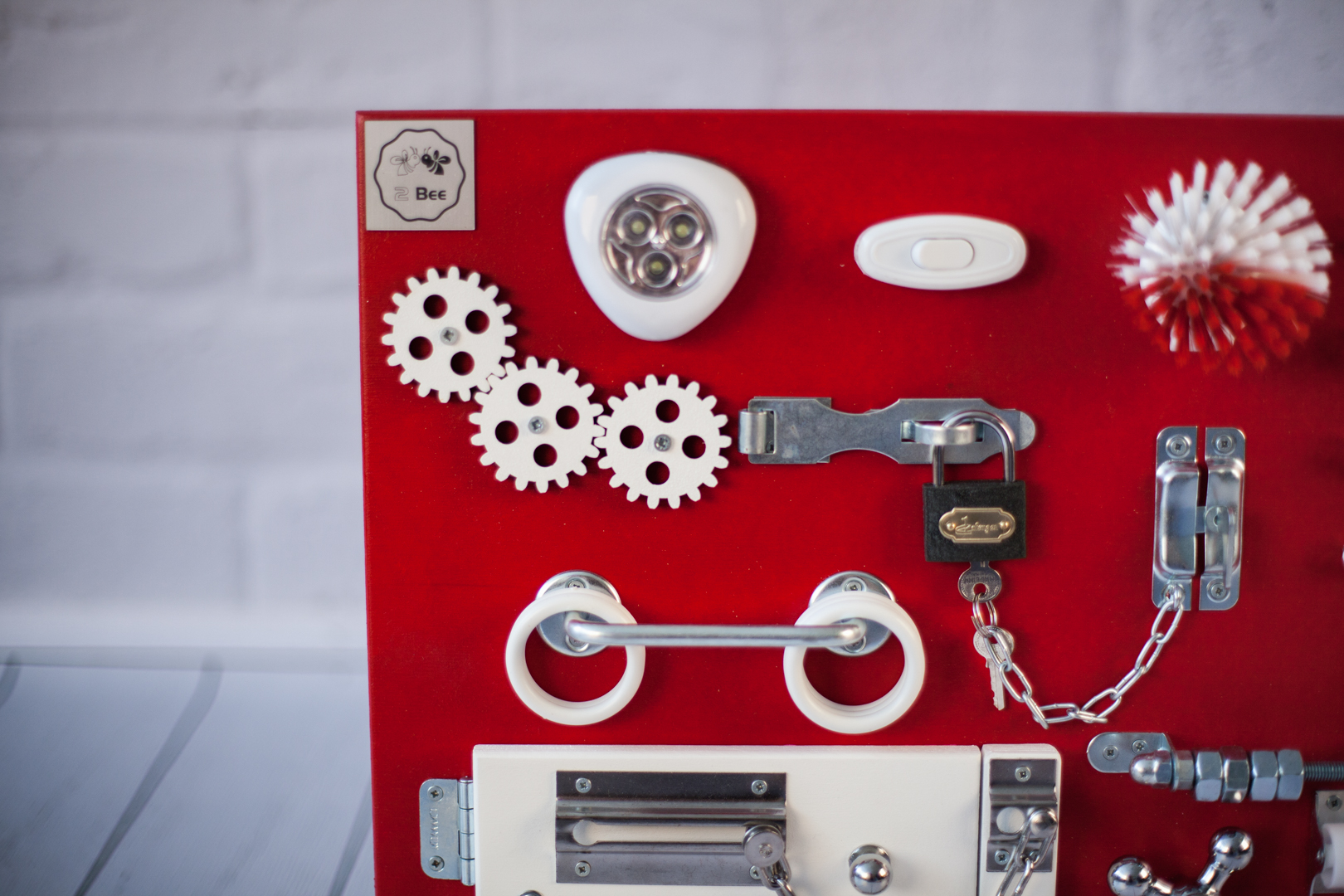 1. Набор дверей с замочками (3 шт) 2. Набор шестерен 3. Кроссовки со шнуровкой 4. Катушка для лески с трещоткой 5. Зиппер 6. Вращающийся валик 7. Лабиринт из 5 фигур 8. Сортер шкантовый из 5 фигур 9. Игрушки на липучке 10. Шкатулка – тайничок 11. Место для хранения других игрушек
