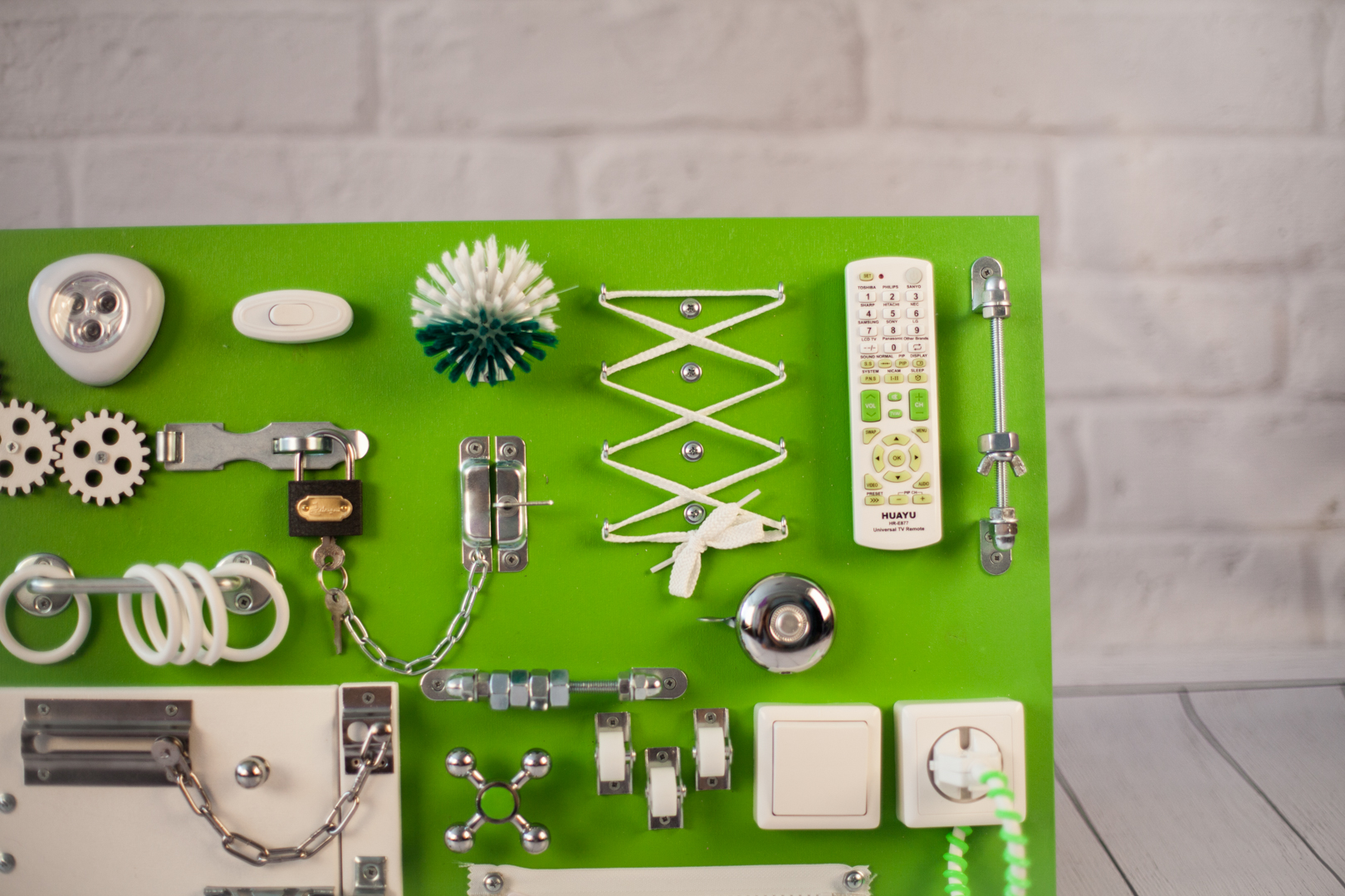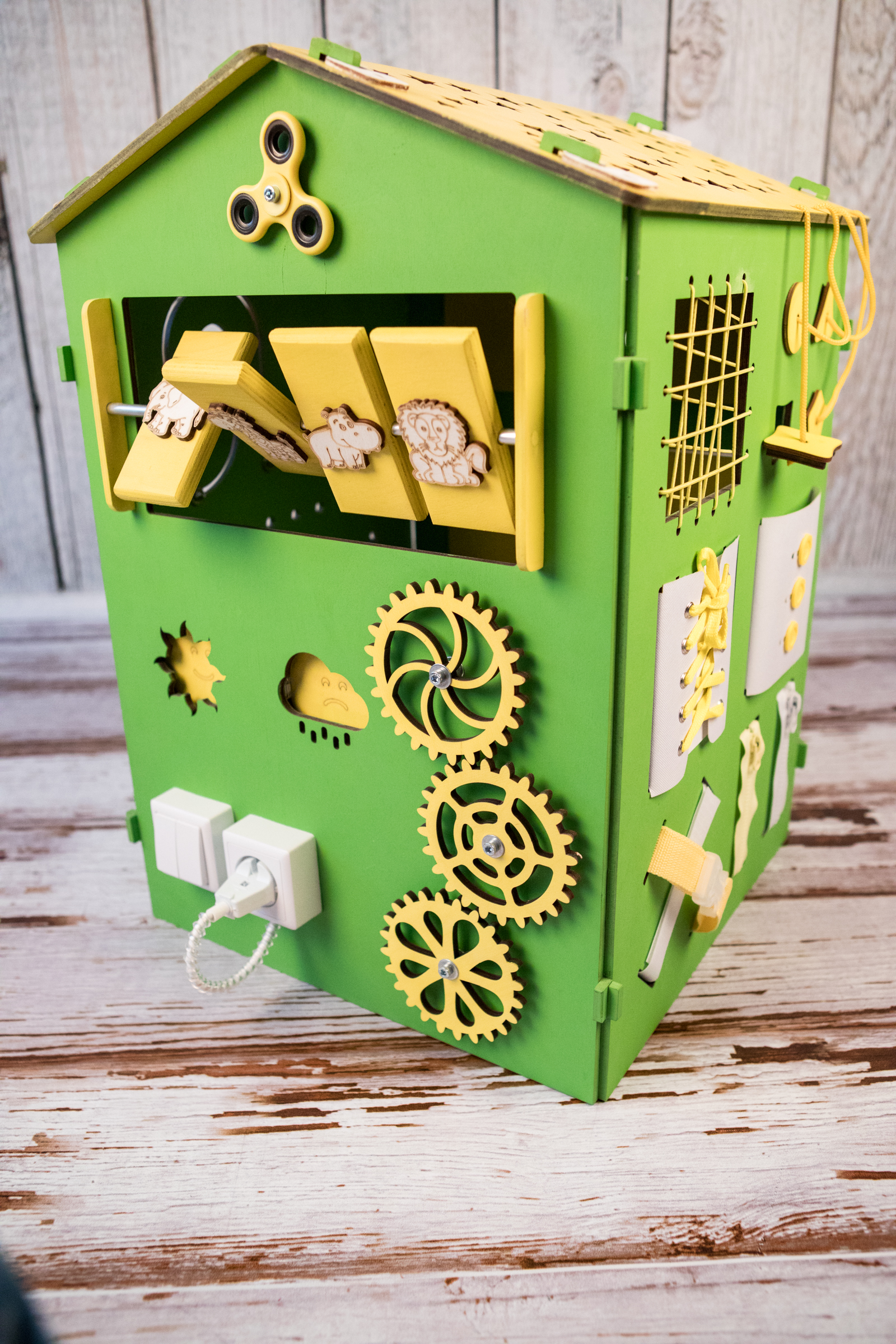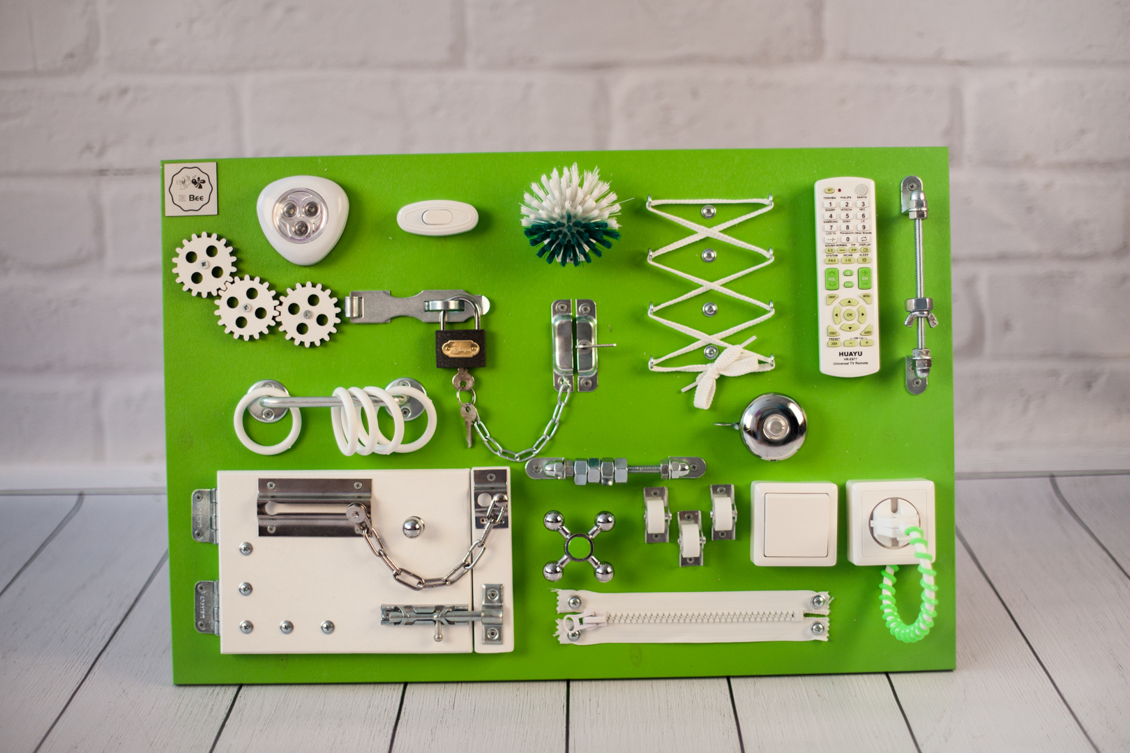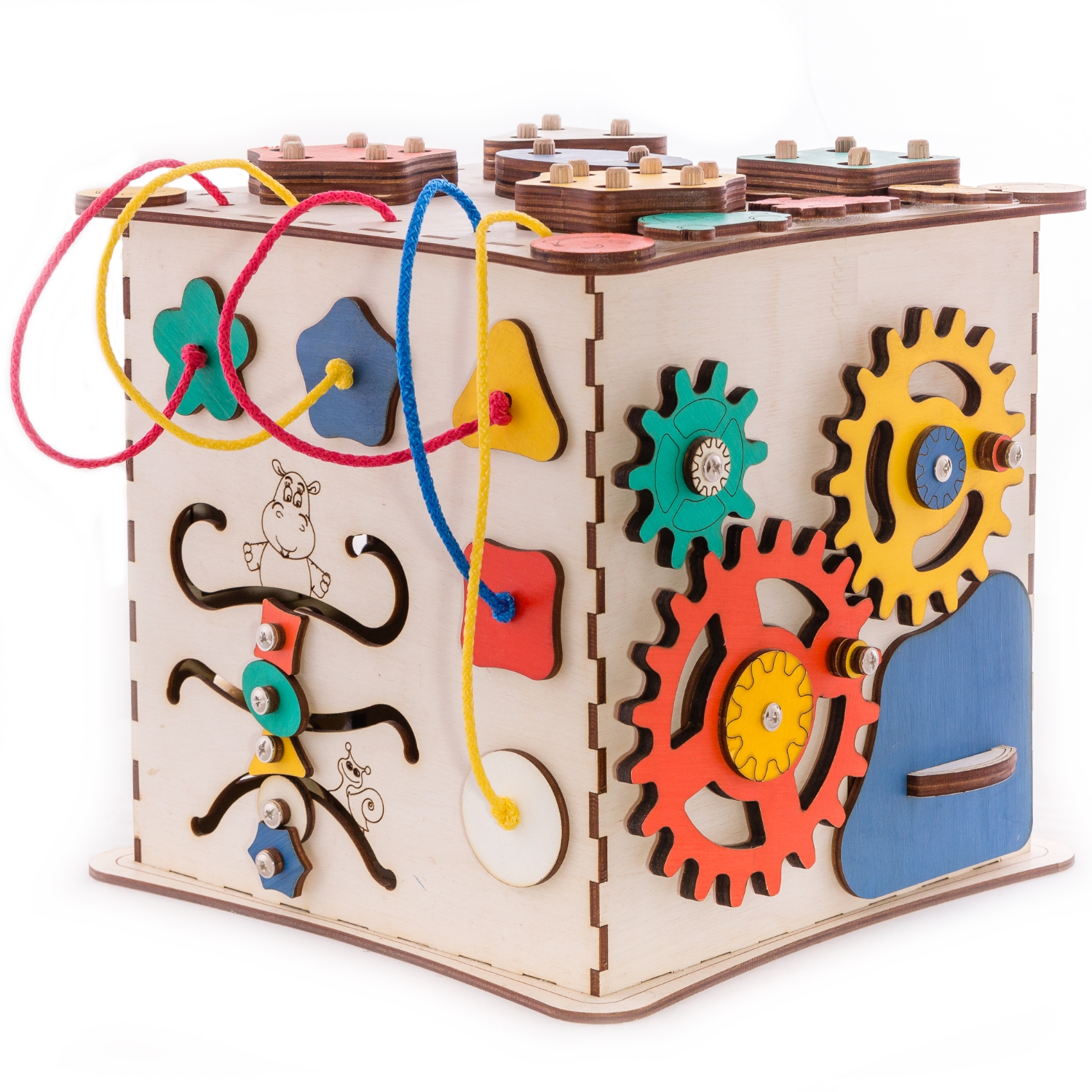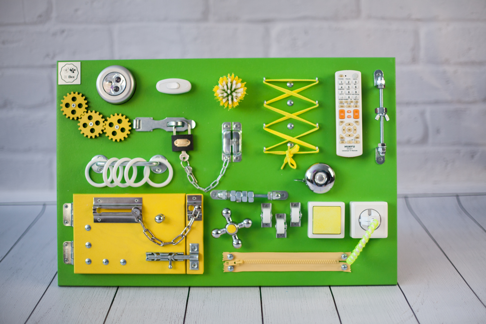 1. Набор дверей с замочками (3 шт) 2. Набор шестерен 3. Кроссовки со шнуровкой 4. Катушка для лески с трещоткой 5. Зиппер 6. Вращающийся валик 7. Лабиринт из 5 фигур 8. Сортер шкантовый из 5 фигур 9. Игрушки на липучке 10. Шкатулка – тайничок 11. Место для хранения других игрушек