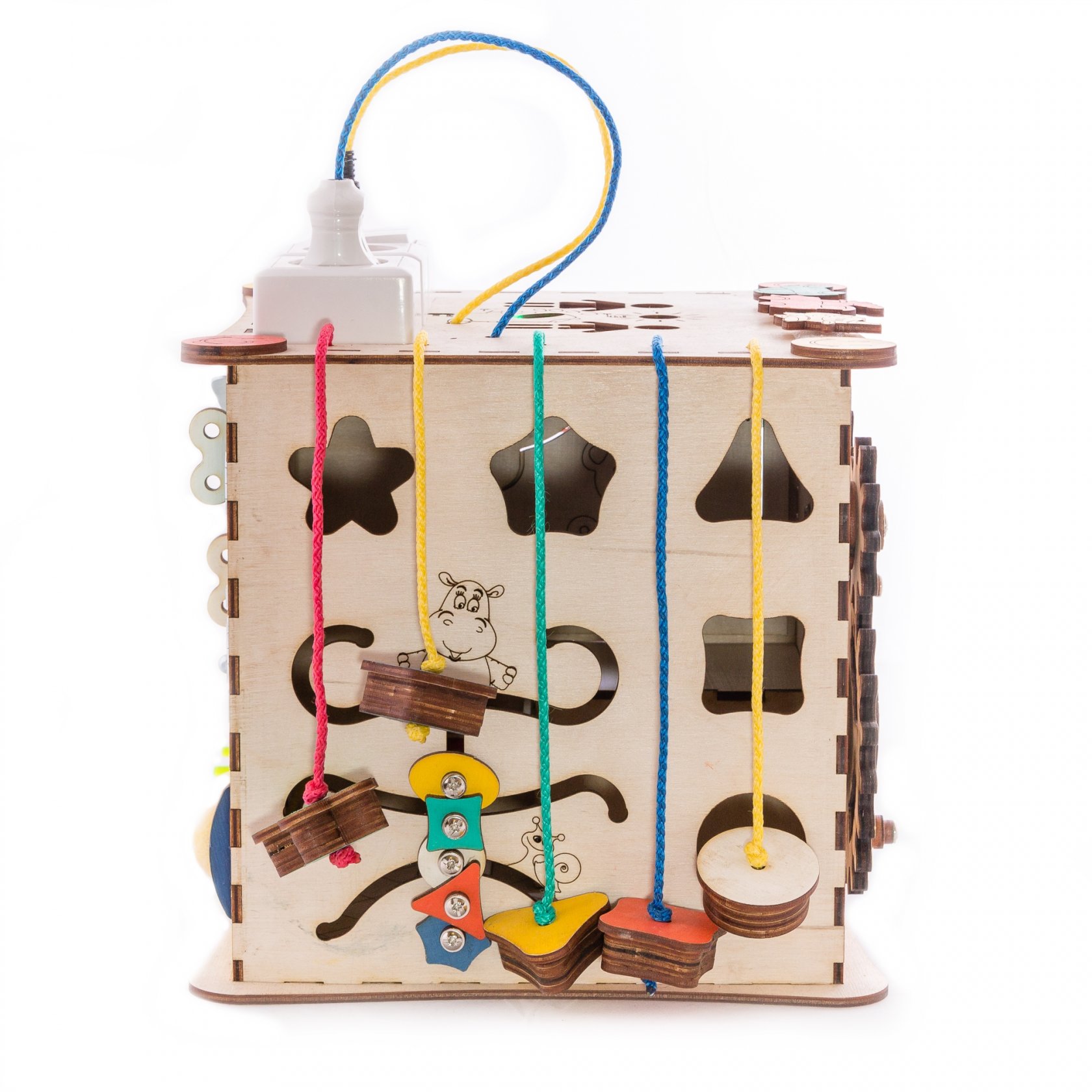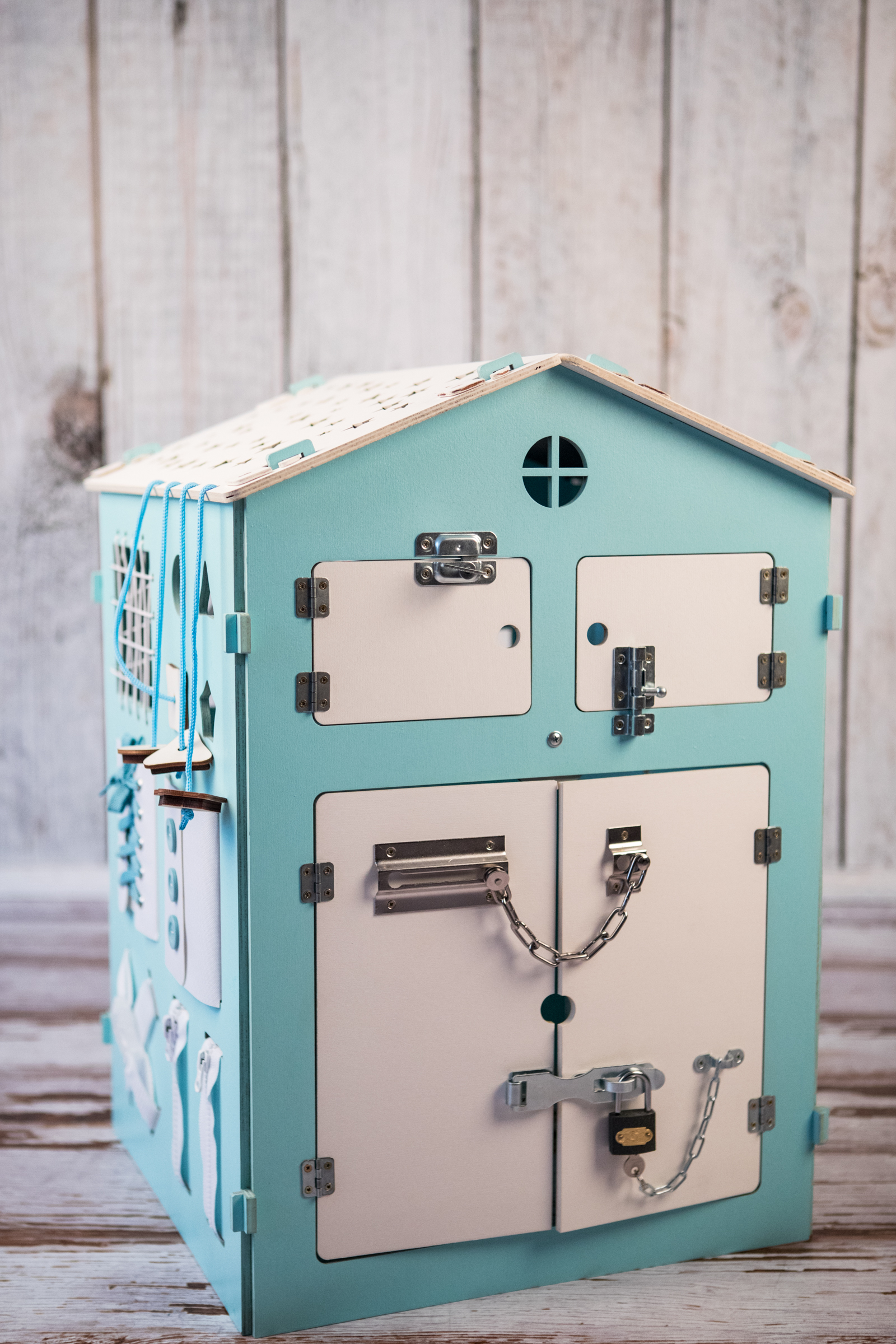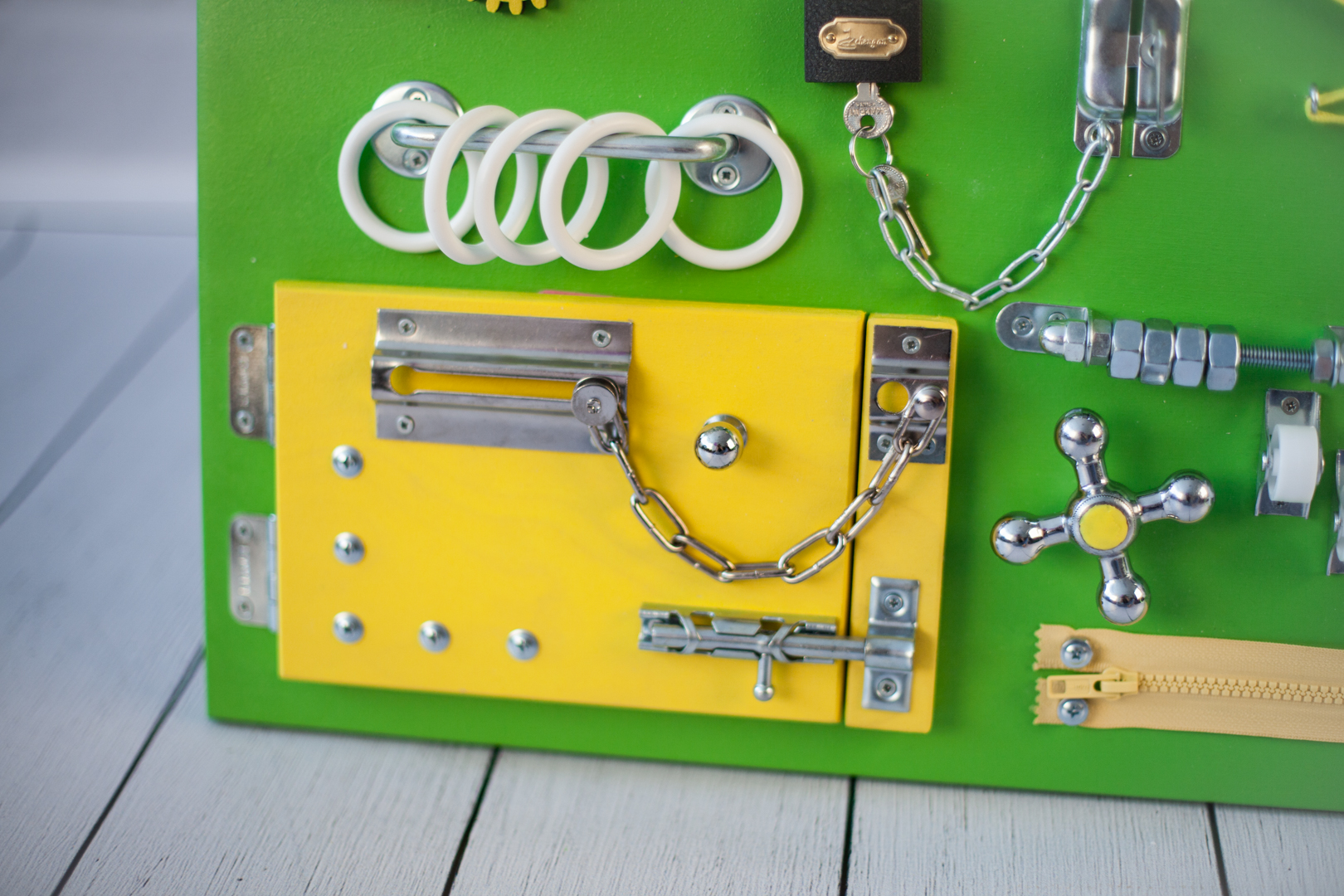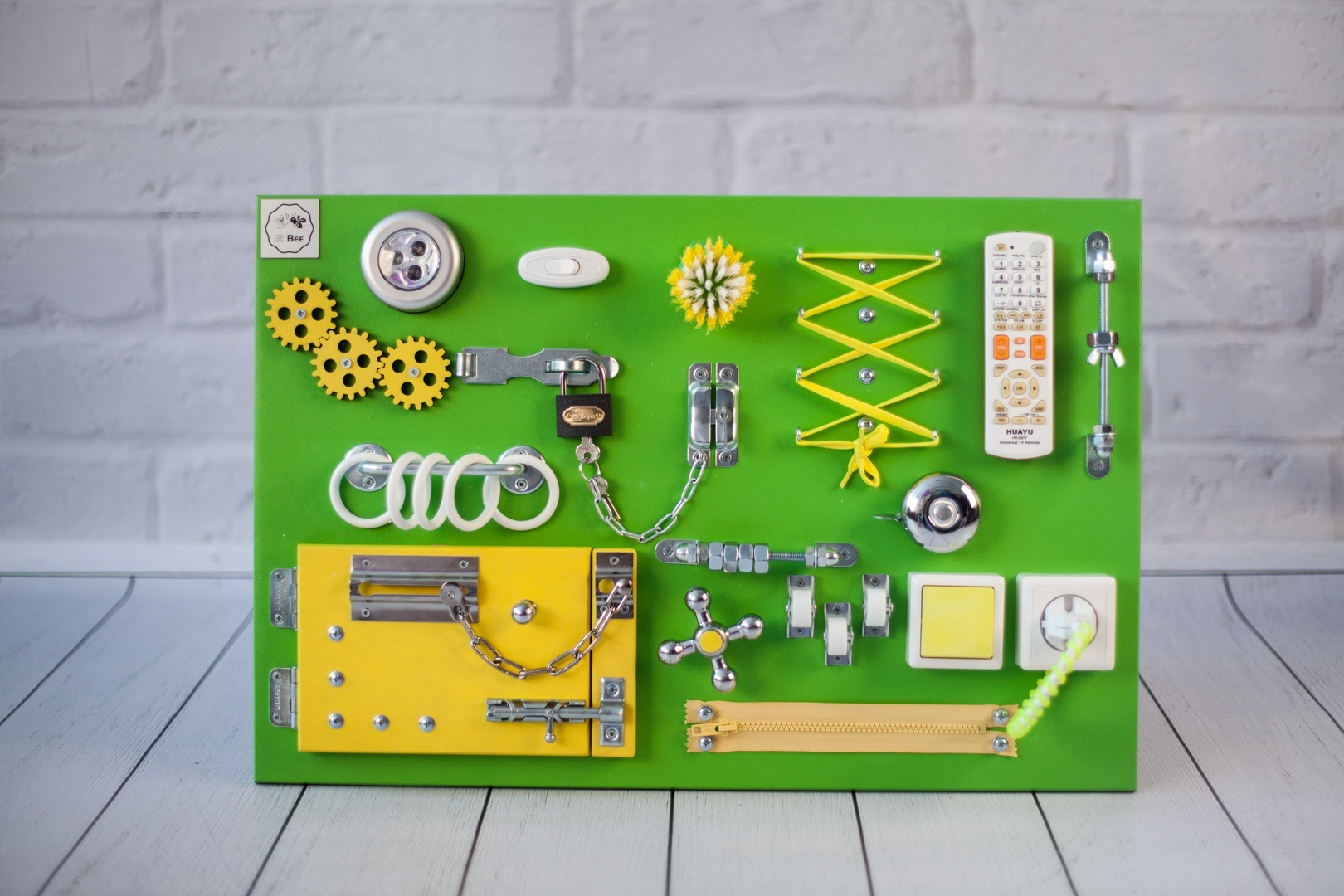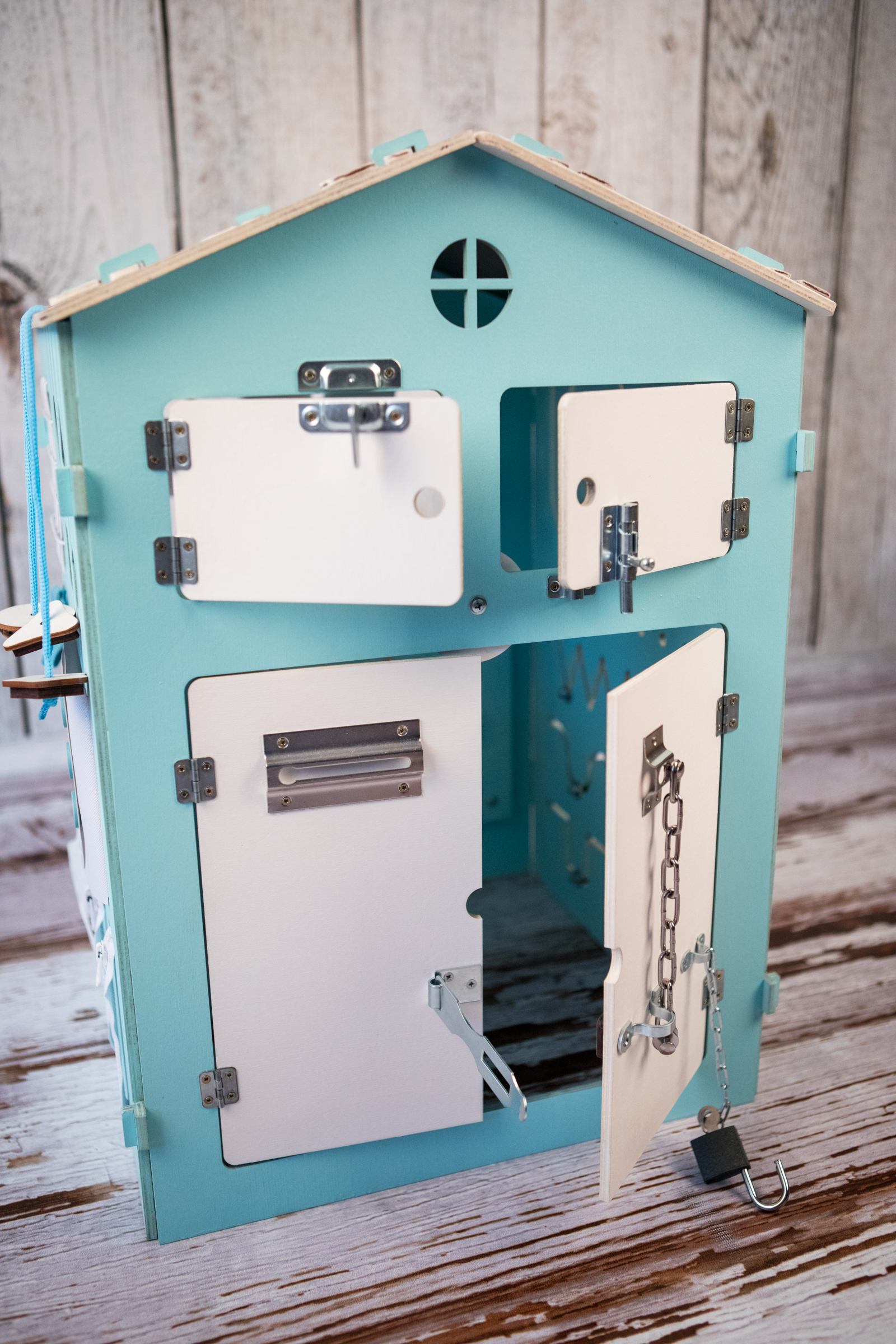 1. Набор дверей с замочками (3 шт) 2. Набор шестерен 3. Кроссовки со шнуровкой 4. Катушка для лески с трещоткой 5. Зиппер 6. Вращающийся валик 7. Лабиринт из 5 фигур 8. Сортер шкантовый из 5 фигур 9. Игрушки на липучке 10. Шкатулка – тайничок 11. Место для хранения других игрушек