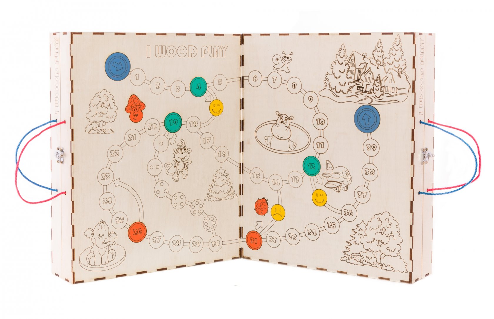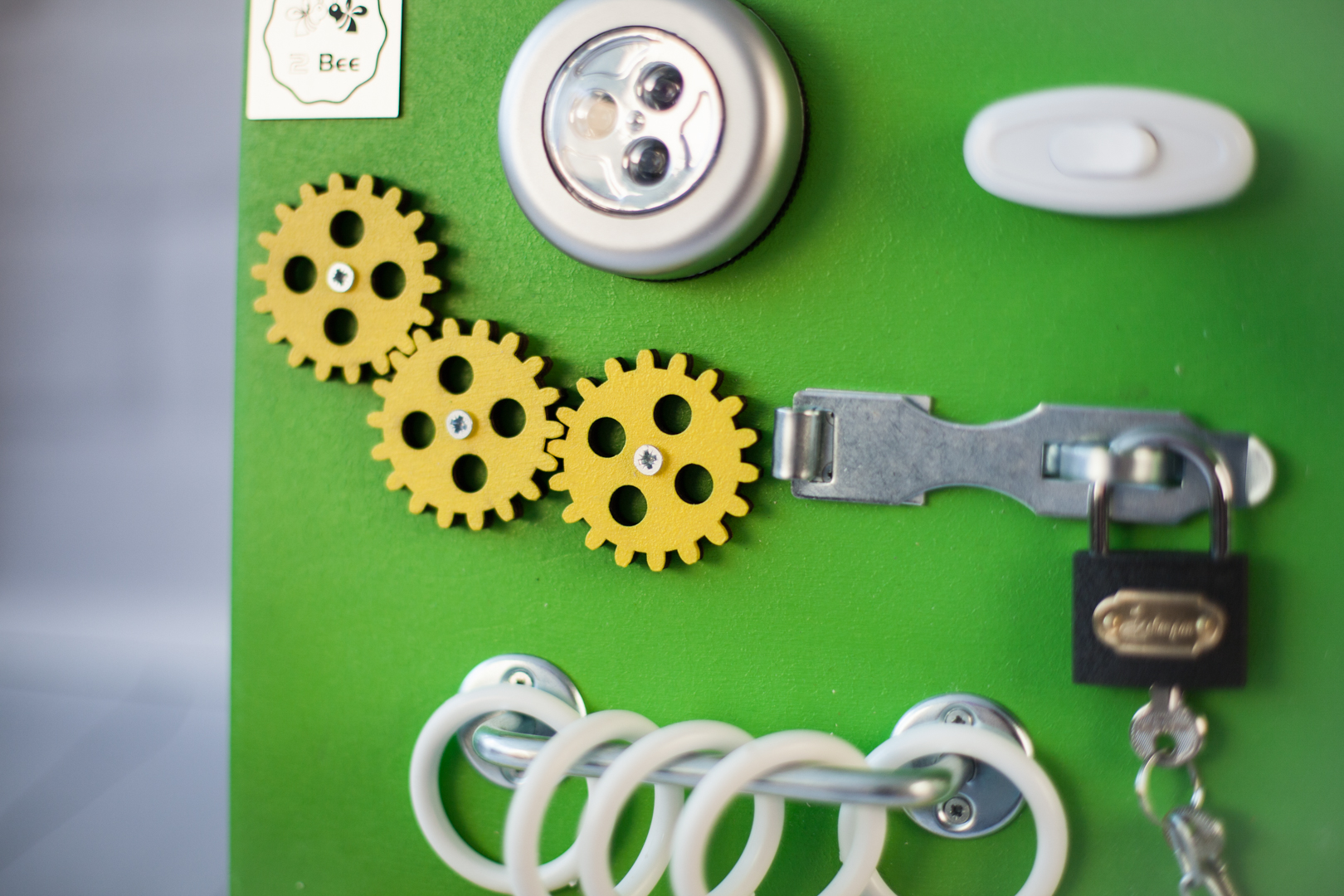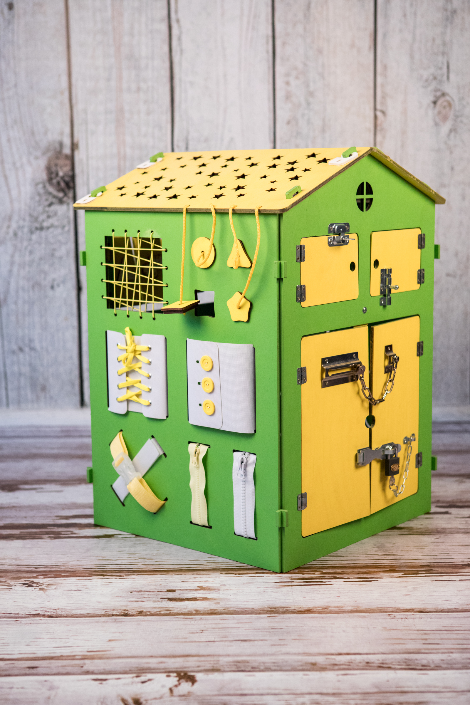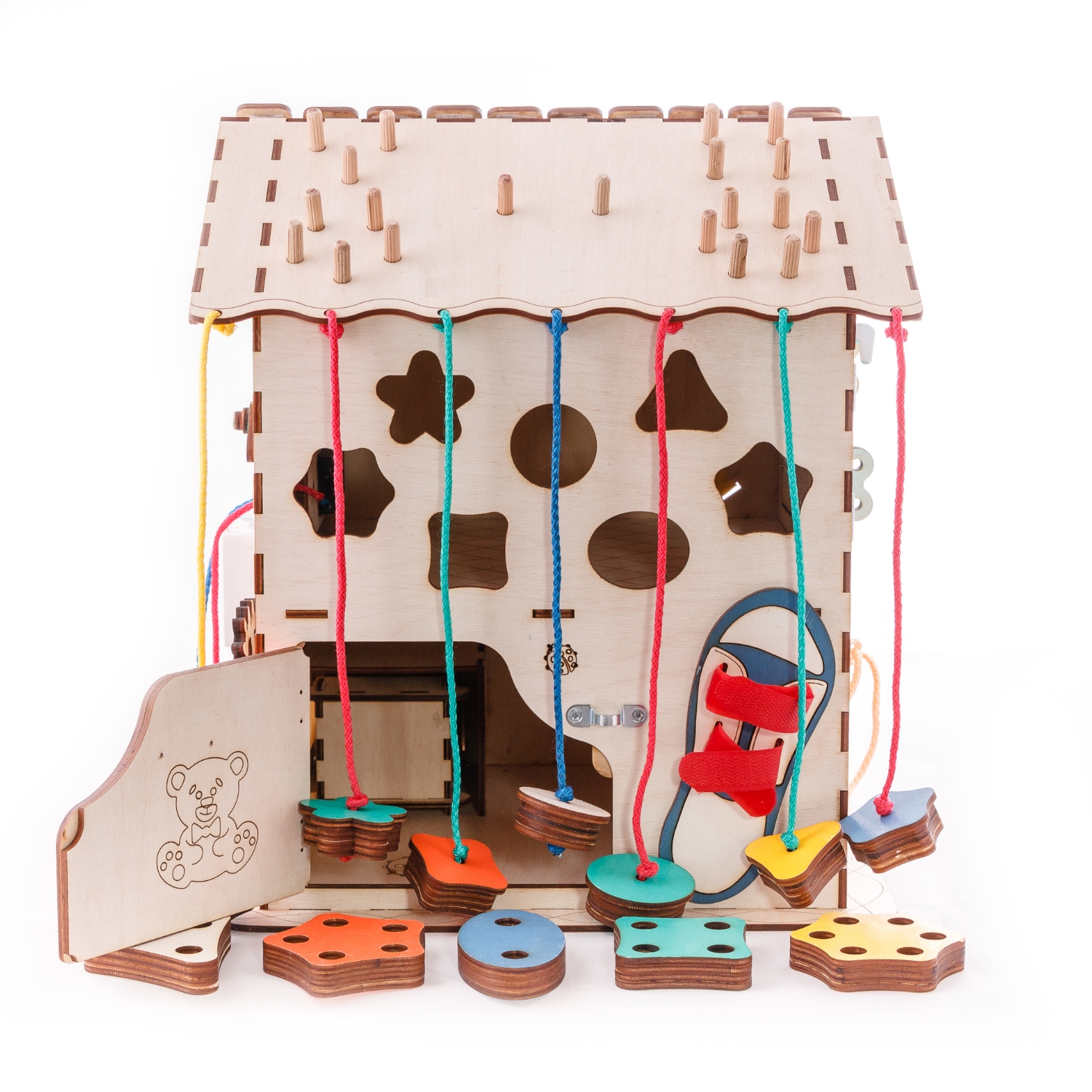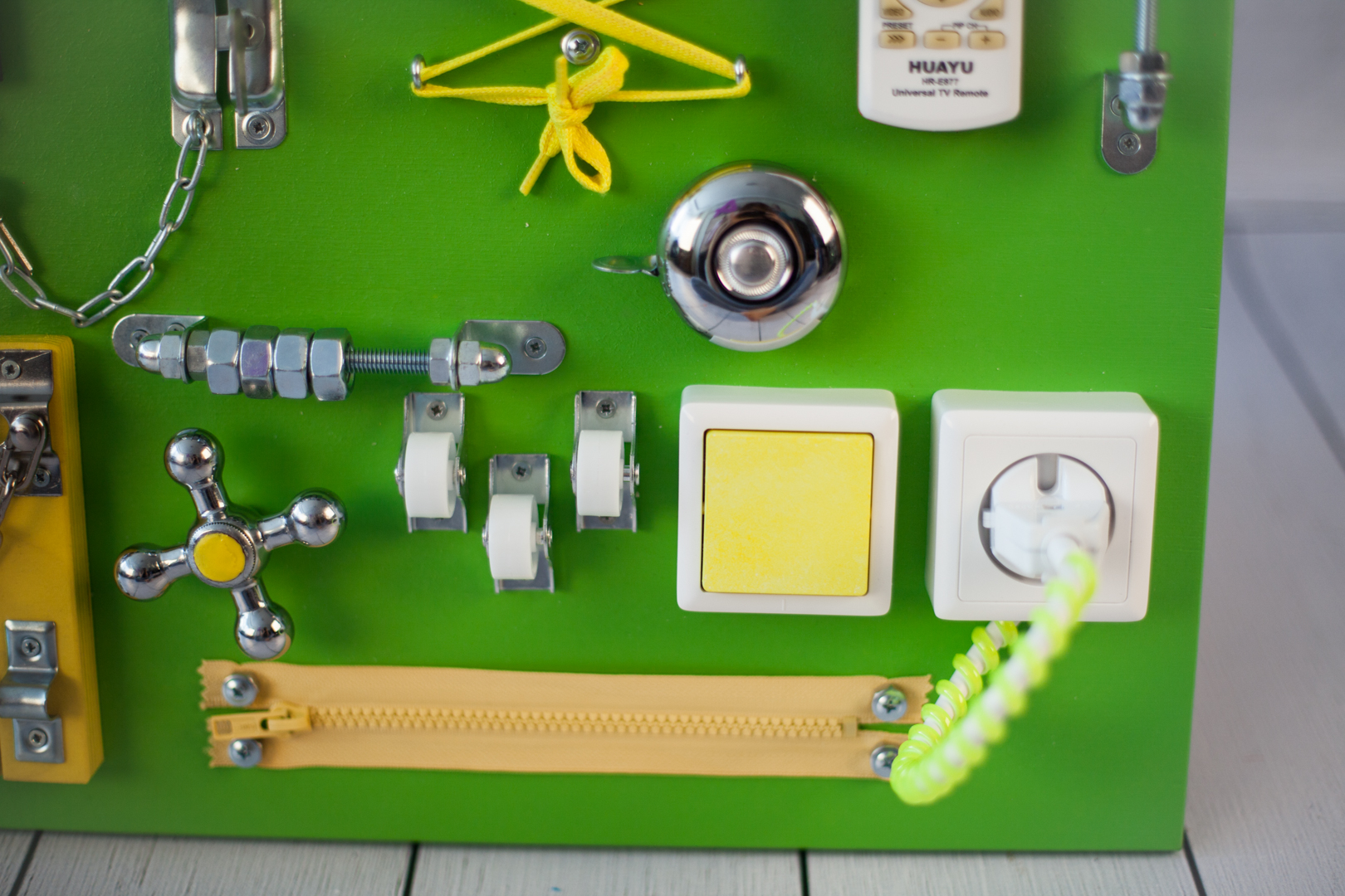 1. Набор дверей с замочками (3 шт) 2. Набор шестерен 3. Кроссовки со шнуровкой 4. Катушка для лески с трещоткой 5. Зиппер 6. Вращающийся валик 7. Лабиринт из 5 фигур 8. Сортер шкантовый из 5 фигур 9. Игрушки на липучке 10. Шкатулка – тайничок 11. Место для хранения других игрушек