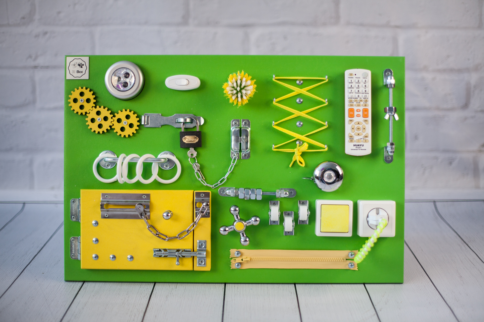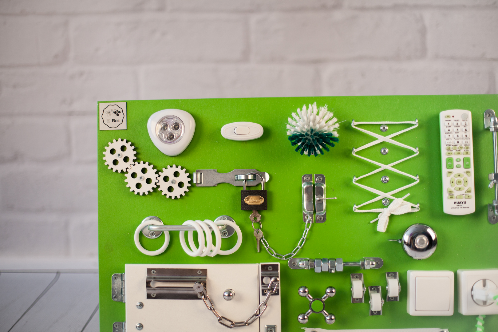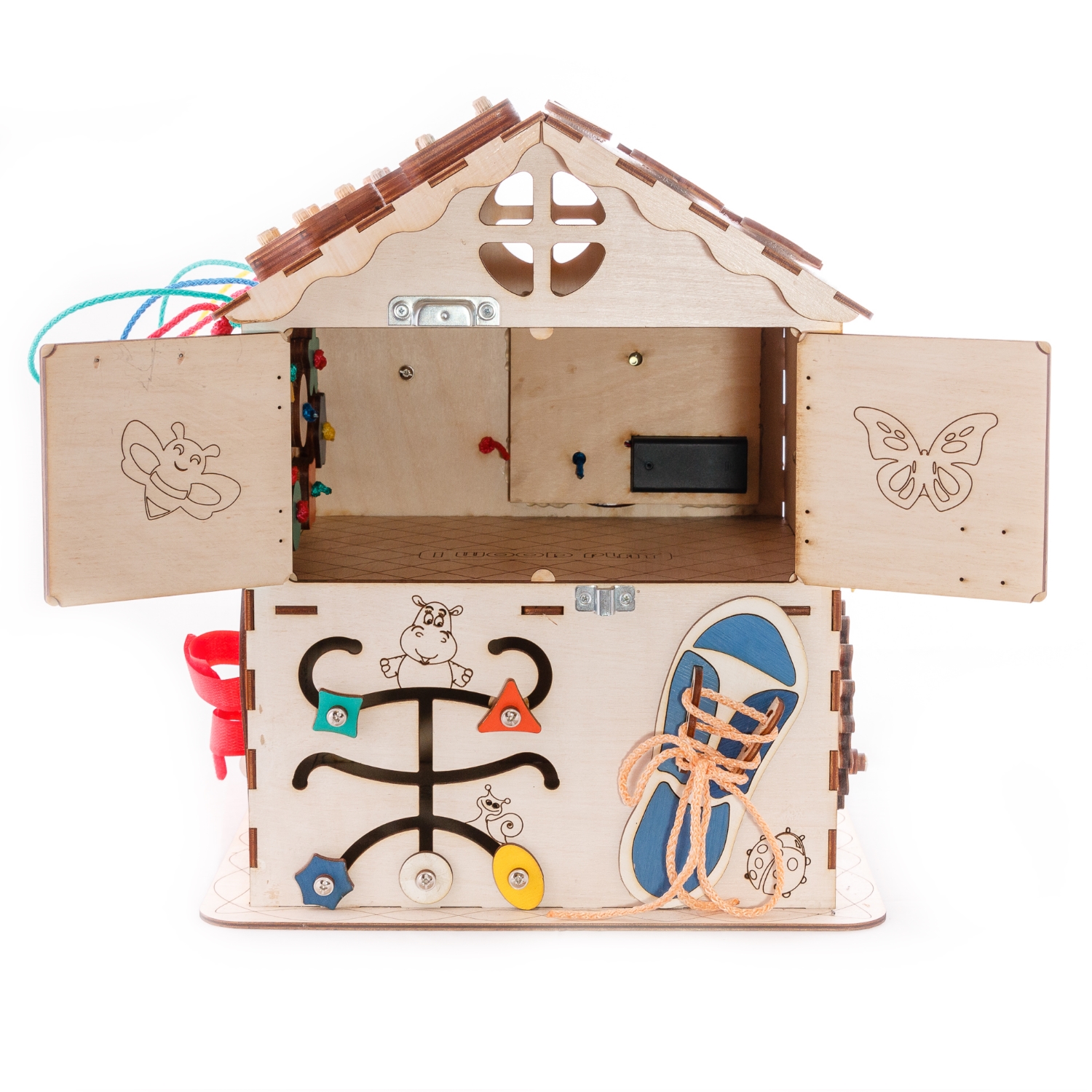 1. Набор дверей с замочками (3 шт) 2. Блок светоиндикации на 5 точек 3. Катушка для лески с трещоткой 4. Набор шестерен круглых 5. Набор шестерен квадратных 6. Кроссовки со шнуровкой и липучкой 7. Зиппер 8. Фигурки на пружинке 9. Часы 10. Лабиринт из 5 фигур 11. Вращающийся валик 12. Шкантовый сортер (на крыше) 13. Магнитное поле, на котором можно писать мелом 14. Ящичек – тайничок 15. Цифры на липучке 16. Фигурки на липучке 17. Почтовый ящик 18. Велосипедный звонок 19. Шкатулка тайник с крышкой