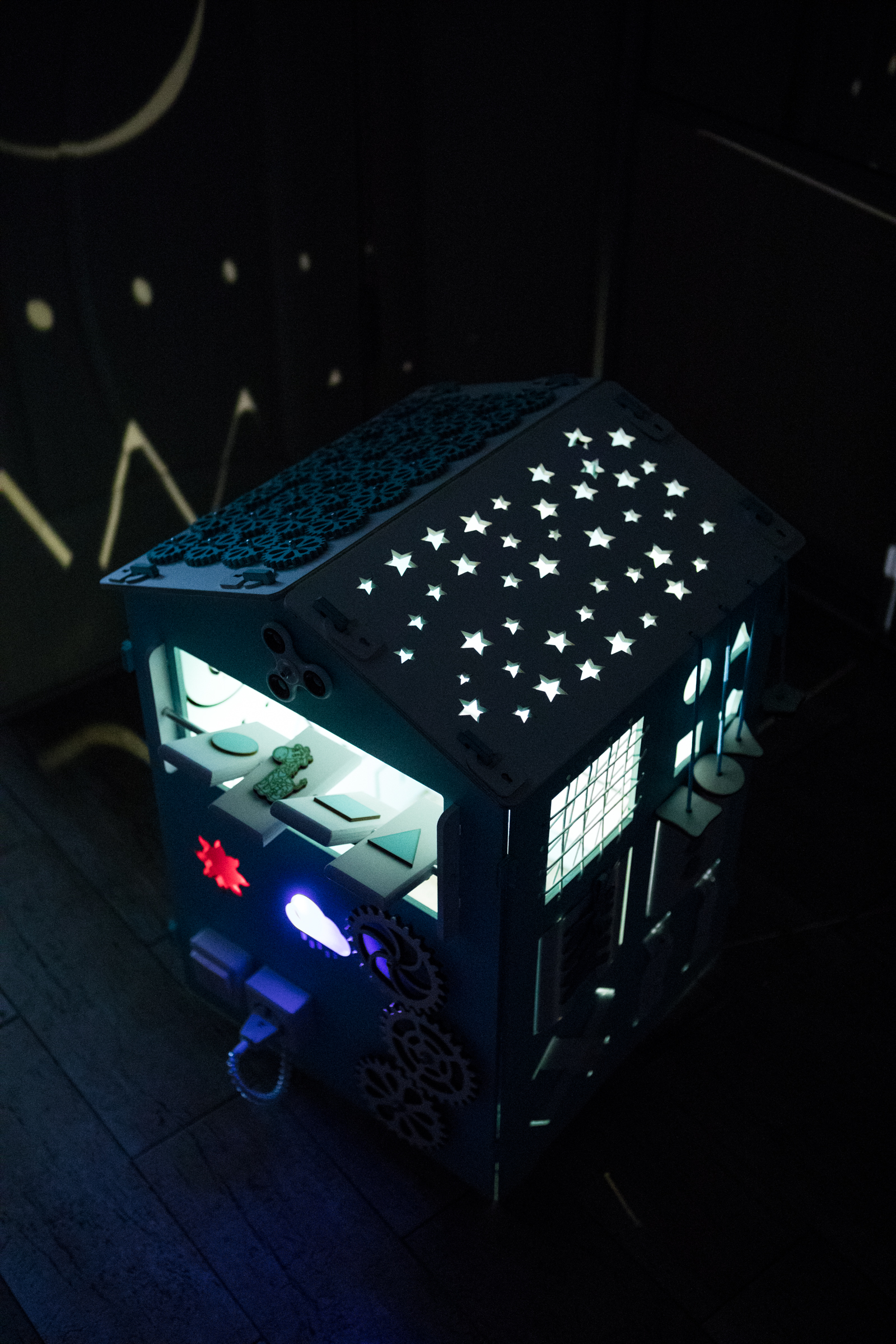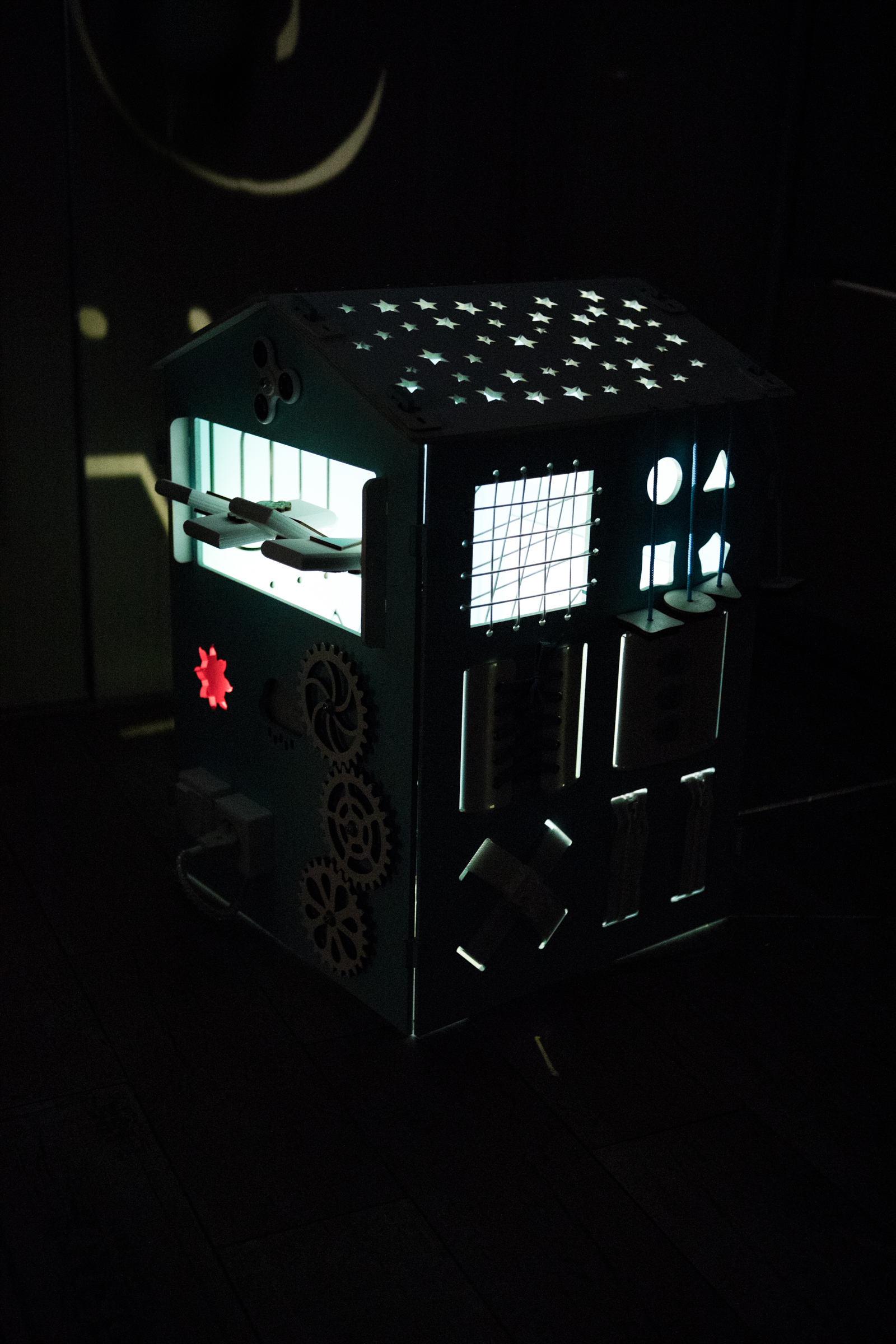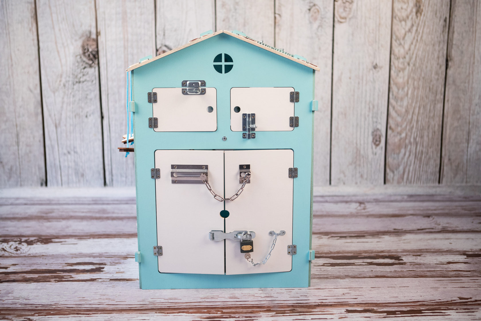 1. Набор дверей с замочками (3 шт) 2. Блок светоиндикации на 5 точек 3. Катушка для лески с трещоткой 4. Набор шестерен круглых 5. Набор шестерен квадратных 6. Кроссовки со шнуровкой и липучкой 7. Зиппер 8. Фигурки на пружинке 9. Часы 10. Лабиринт из 5 фигур 11. Вращающийся валик 12. Шкантовый сортер (на крыше) 13. Магнитное поле, на котором можно писать мелом 14. Ящичек – тайничок 15. Цифры на липучке 16. Фигурки на липучке 17. Почтовый ящик 18. Велосипедный звонок 19. Шкатулка тайник с крышкой