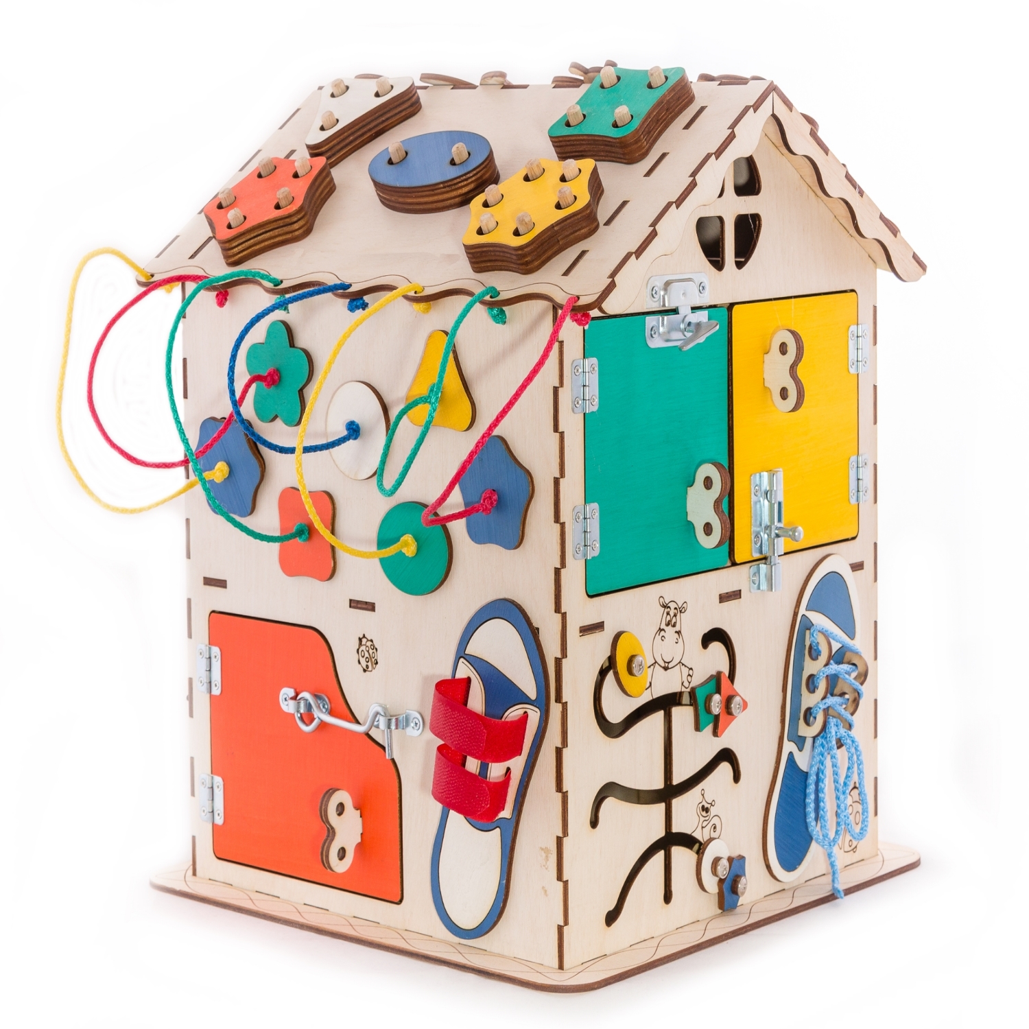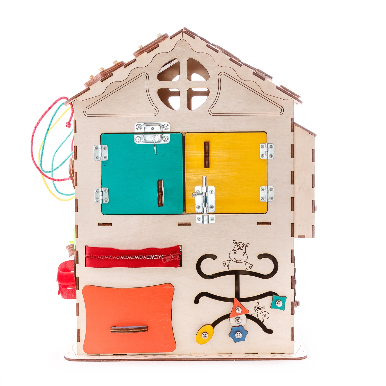 1. Набор дверей с замочками (3 шт) 2. Блок светоиндикации из 5 точек разного цвета 3. Катушка для лески с трещоткой 4. Набор шестерен круглых 5. Набор шестерен квадратных 6. Кроссовки со шнуровкой и липучкой 7. Зиппер 8. Фигурки на пружинке 9. Часы 10. Лабиринт из 5 фигур 11. Вращающийся валик 12. Шкантовый сортер (на крыше) 13. Меловое поле на котором можно писать мелом 14. Ящичек - тайничок 15. Цифры на липучке 16. Фигурки на липучке 17. Зоны для хранения других игрушек