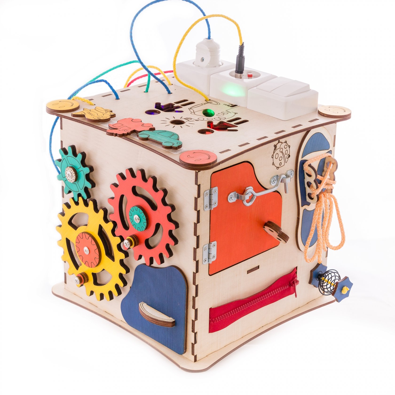 Размер 25х25х25см. 1. Набор дверей с замочками (3 шт) 2. Набор шестерен 3. Кроссовки со шнуровкой 4. Катушка для лески с трещоткой 5. Зиппер 6. Вращающийся валик 7. Лабиринт из 5 фигур 8. Блок светоиндикации 5 точек 9. Игрушки на липучке 10. Шкатулка – тайничок 11. Место для хранения других игрушек