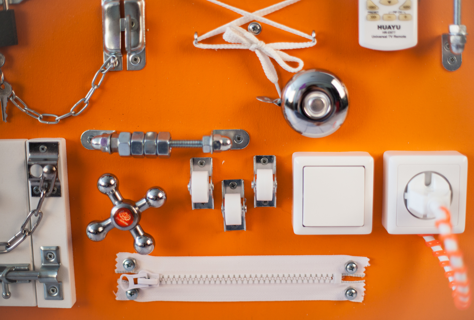 1. Фонарик 2. Набор шестерен круглых 3. Выключатель-мини 4. Выключатель-макси 5. Щетка 6. Шнурок 7. TV-пульт со светодиодом 8. Штанга с гайкой на резьбе 9. Штанга с 4-мя гайками без резьбы 10. Велосипедный звонок 11. Розетка с вилкой 12. Зиппер 13. Вентиль 14. 3 колесика 15. Дверца с цепочкой и шпингалетом 16. Штанга с кольцами 17. Замочек с ключами